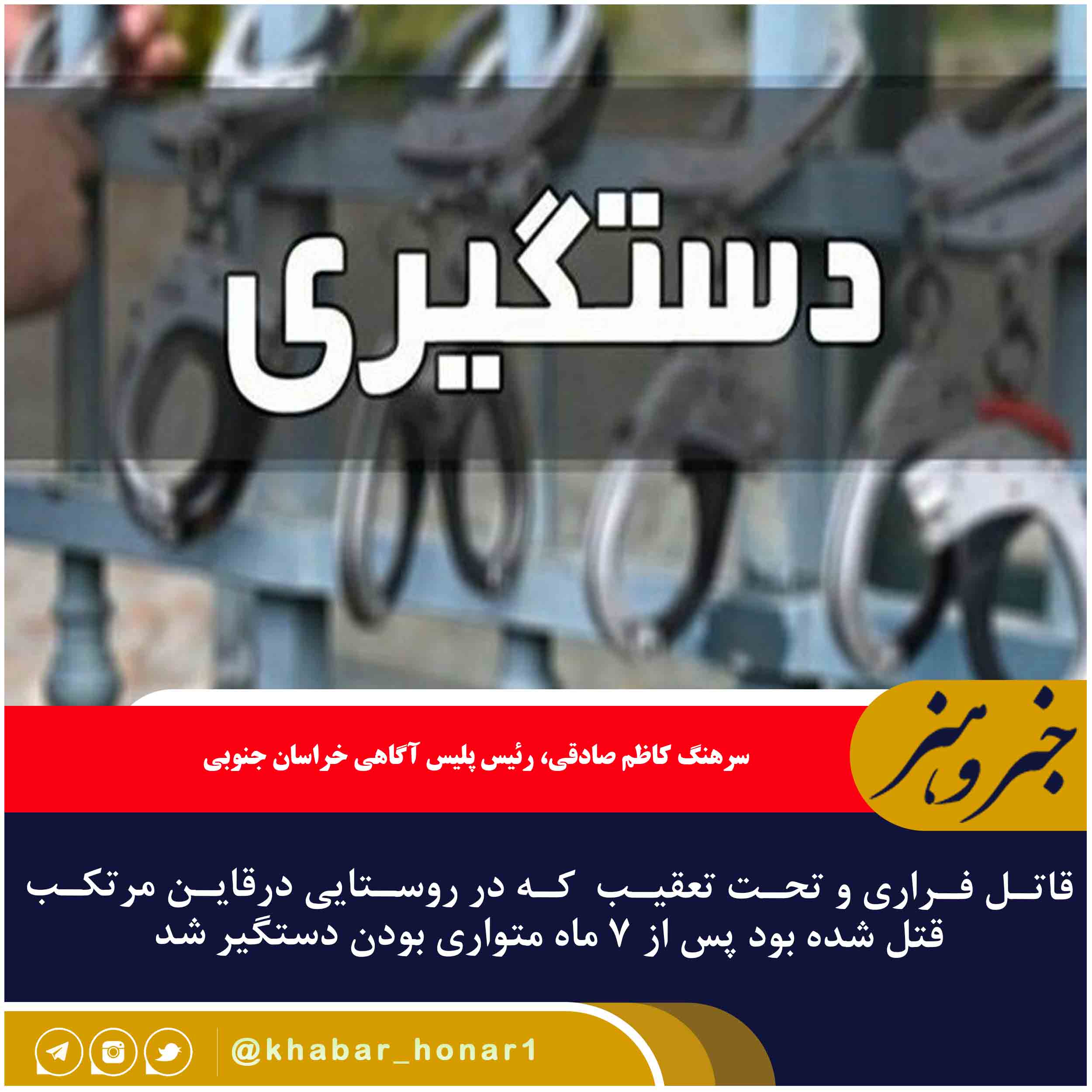 رئیس پلیس آگاهی خراسان جنوبی گفت: کارآگاهان پلیس آگاهی استان با انجام اقدامات فنی و کار اطلاعاتی و بهرهگیری از روشهای نوین پلیسی موفق شدند محل اختفای قاتل را شناسایی و با هماهنگی قضائی متهم را پس از هفت ماه در حالی که با خودروی کامیونت قصد فرار مجدد به مکان نامعلومی داشت در محور زاهدان به بیرجند در یک عملیات منسجم و غافلگیرانه دستگیر کنند.