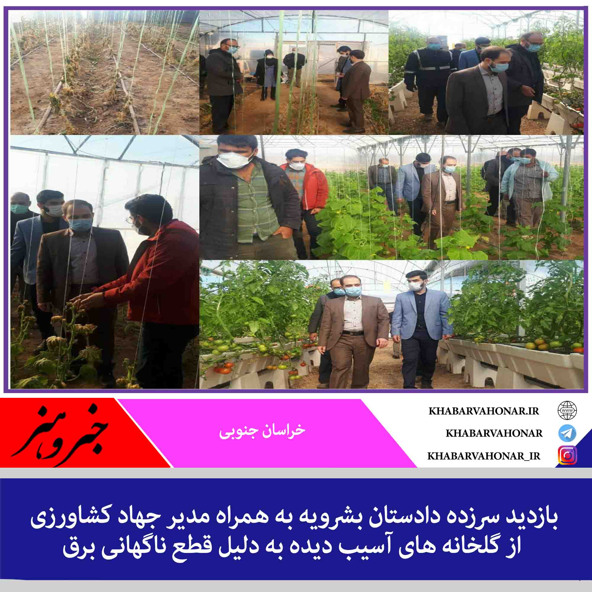 ?در این بازدید که صبح امروز صورت گرفت ، دادستان بشرویه از هر سه گلخانه داخل و خارج شهر شخصا بازدید و ضمن گفتگو با خسارت دیدگان ، خسارت های وارده را نیز از نزدیک بررسی کرد .
