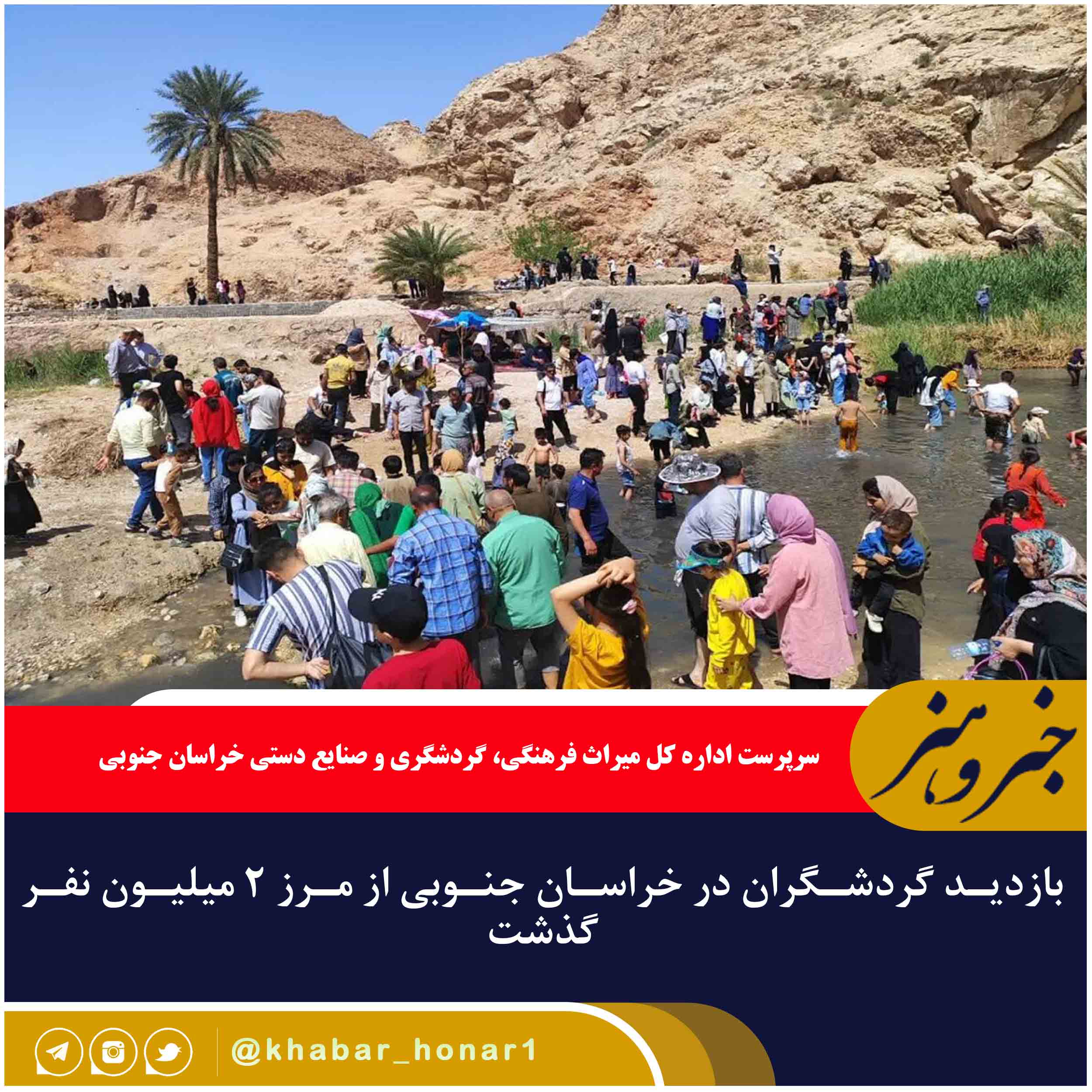 سرپرست اداره کل میراث فرهنگی، گردشگری و صنایع دستی خراسان جنوبی گفت: تعطیلات نوروز امسال ۲ میلیون و ۳۸۰ هزار و ۱۲۵ گردشگر از جاذبههای تاریخی، فرهنگی و گردشگری استان دیدن کردند که نسبت به مدت مشابه سال گذشته بیش از ۵۰ درصد افزایش داشته است.