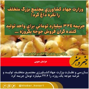 ، بازرسی و نظارت وزارت جهادکشاورزی مجتمع متخلف تولید و عرضه جوجه یک روزه، را ۳۲.۴ میلیارد تومان جریمه کرد که بر اساس قانون جدید سازمان تعزیرات حکومتی مصوب سران قوا، جرایم از مأخذ ۱۰ برابر محاسبه و اعمال میشود و جریمه این واحد ۳۲۴ میلیارد تومان شد.