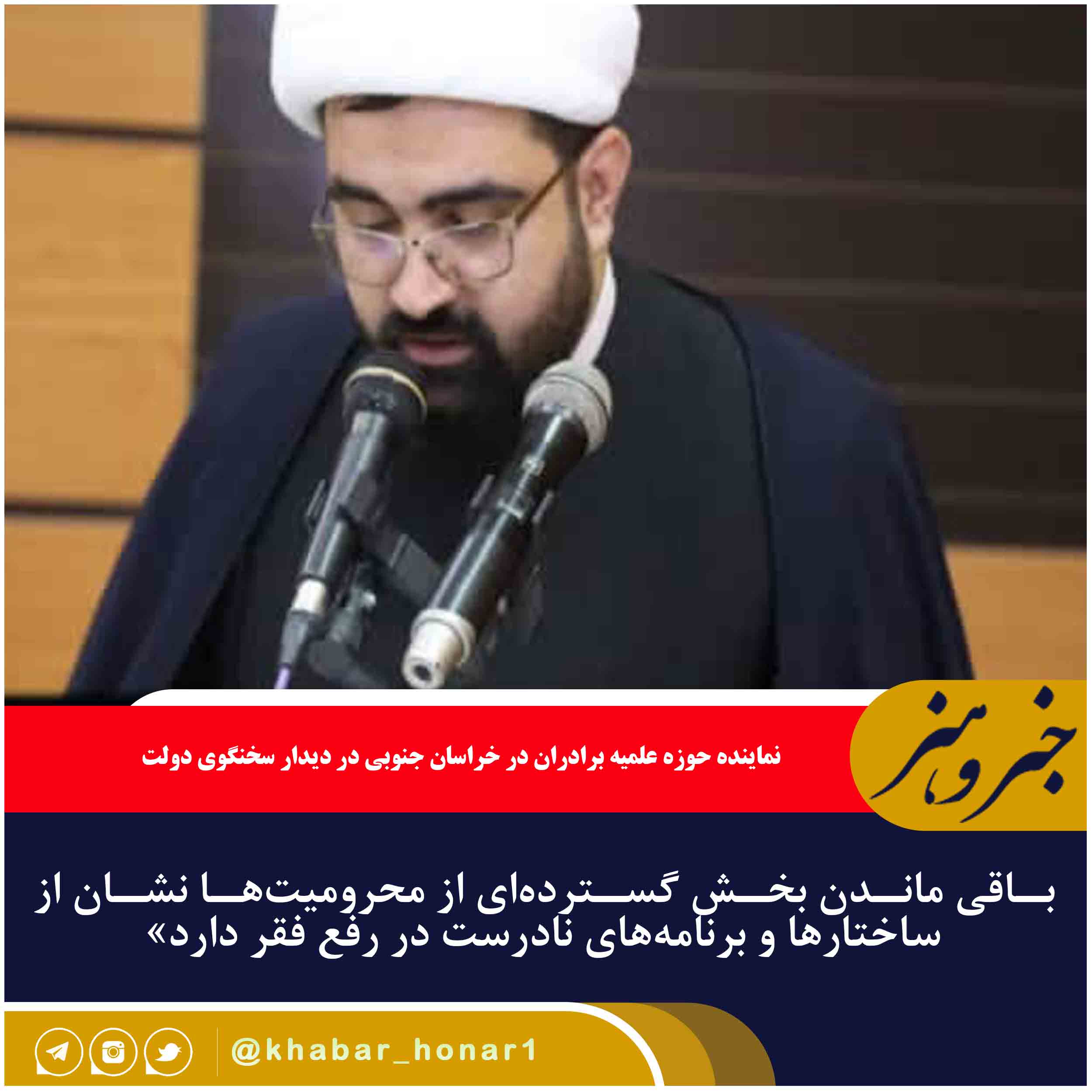 نماینده حوزه علمیه برادران در خراسان جنوبی در دیدار سخنگوی دولت ، با تأکید بر اینکه اجرای عدالت اجتماعی باعث کم شدن آسیبهای فرهنگی است، افزود: «کم بودن مکانهای فرهنگی و ورزشی در استان از جمله مشکلات موجود بوده به گونهای که برای بانوان و جوانان اقدام خاصی انجام نشده است».