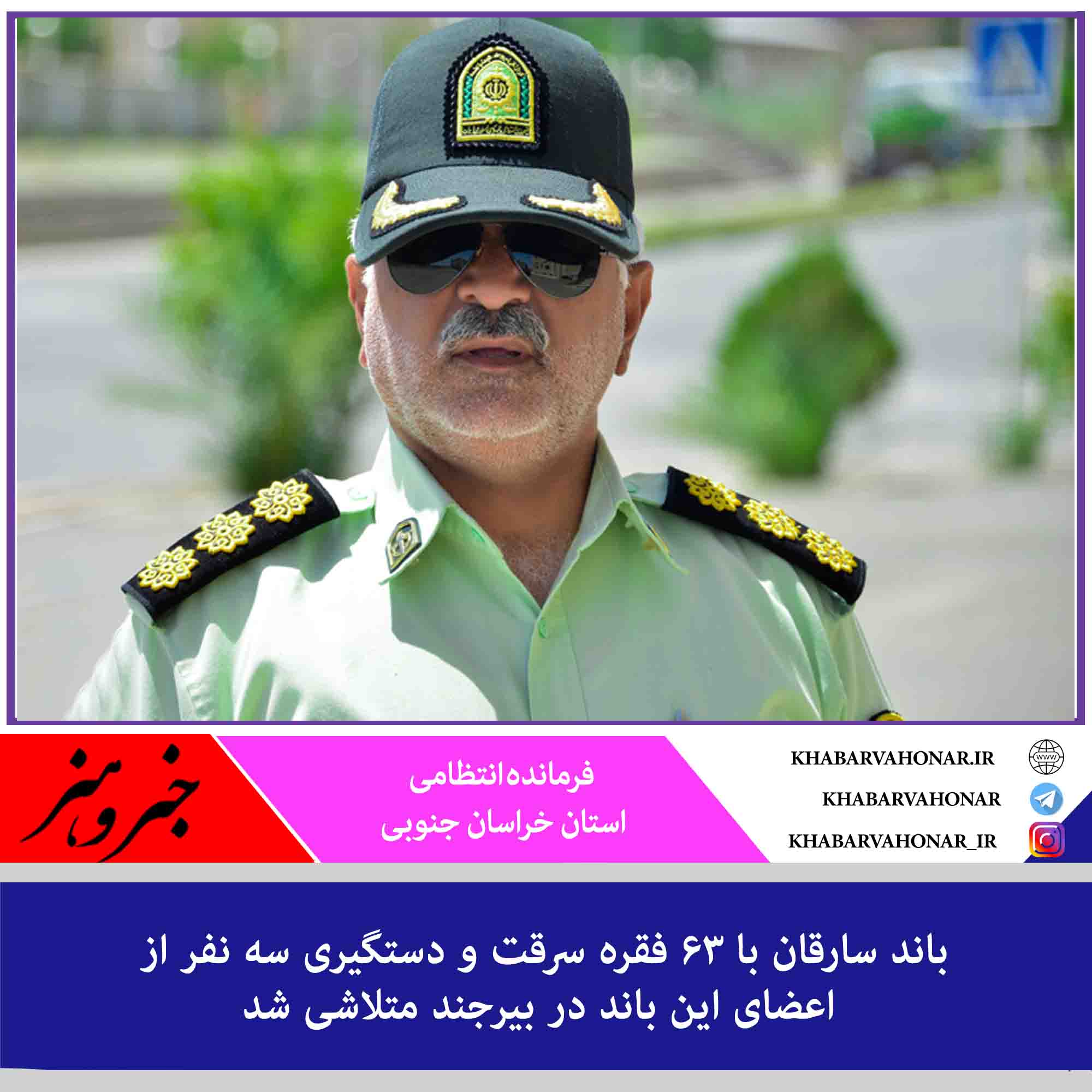 فرمانده انتظامی استان خراسان جنوبی گفت: باند سارقان با ۶۳ فقره سرقت و دستگیری سه نفر از اعضای این باند در بیرجند متلاشی شد.