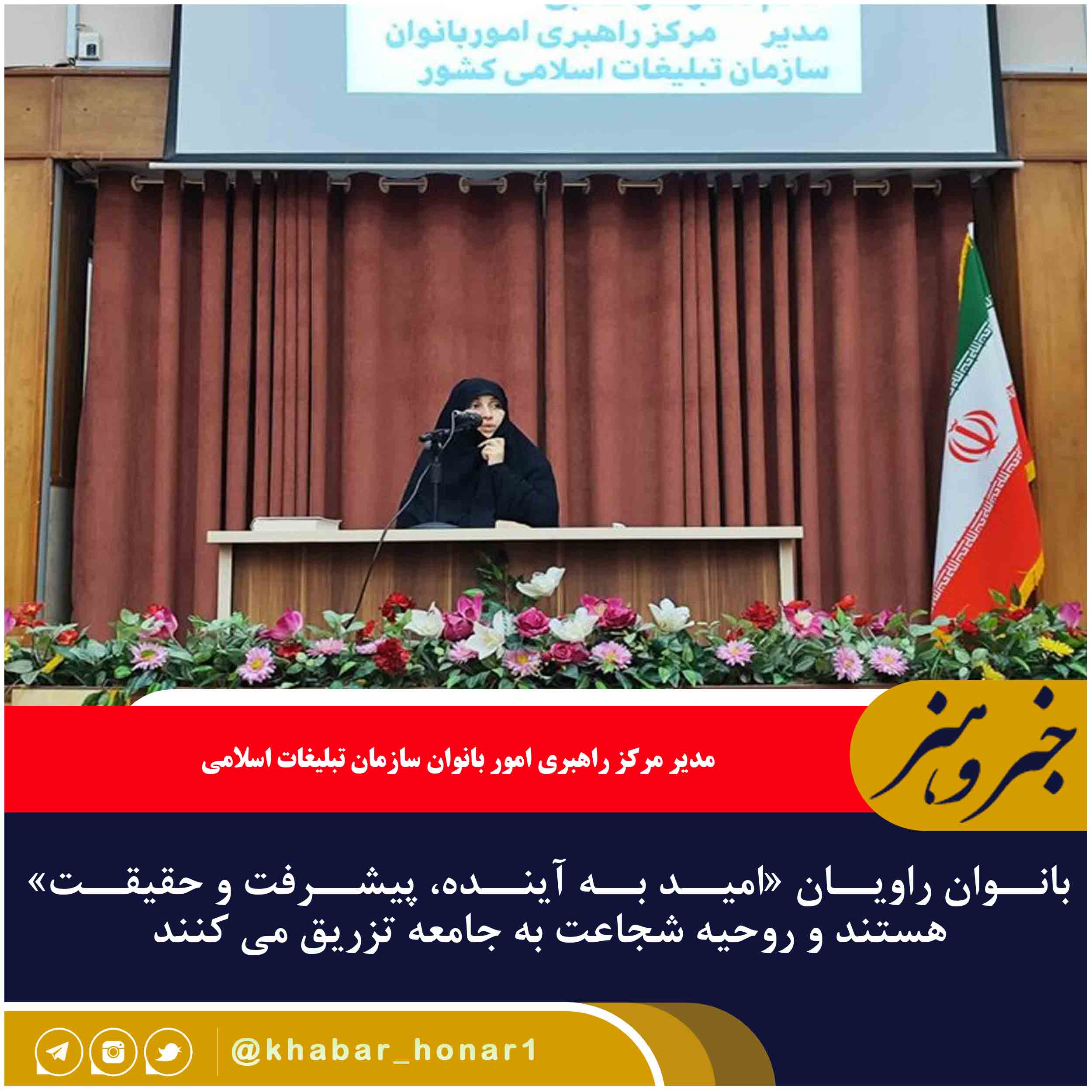 مدیر مرکز راهبری امور بانوان سازمان تبلیغات اسلامی گفت: بانوان راویان «امید به آینده، پیشرفت و حقیقت» هستند و روحیه شجاعت به جامعه تزریق می کنند.