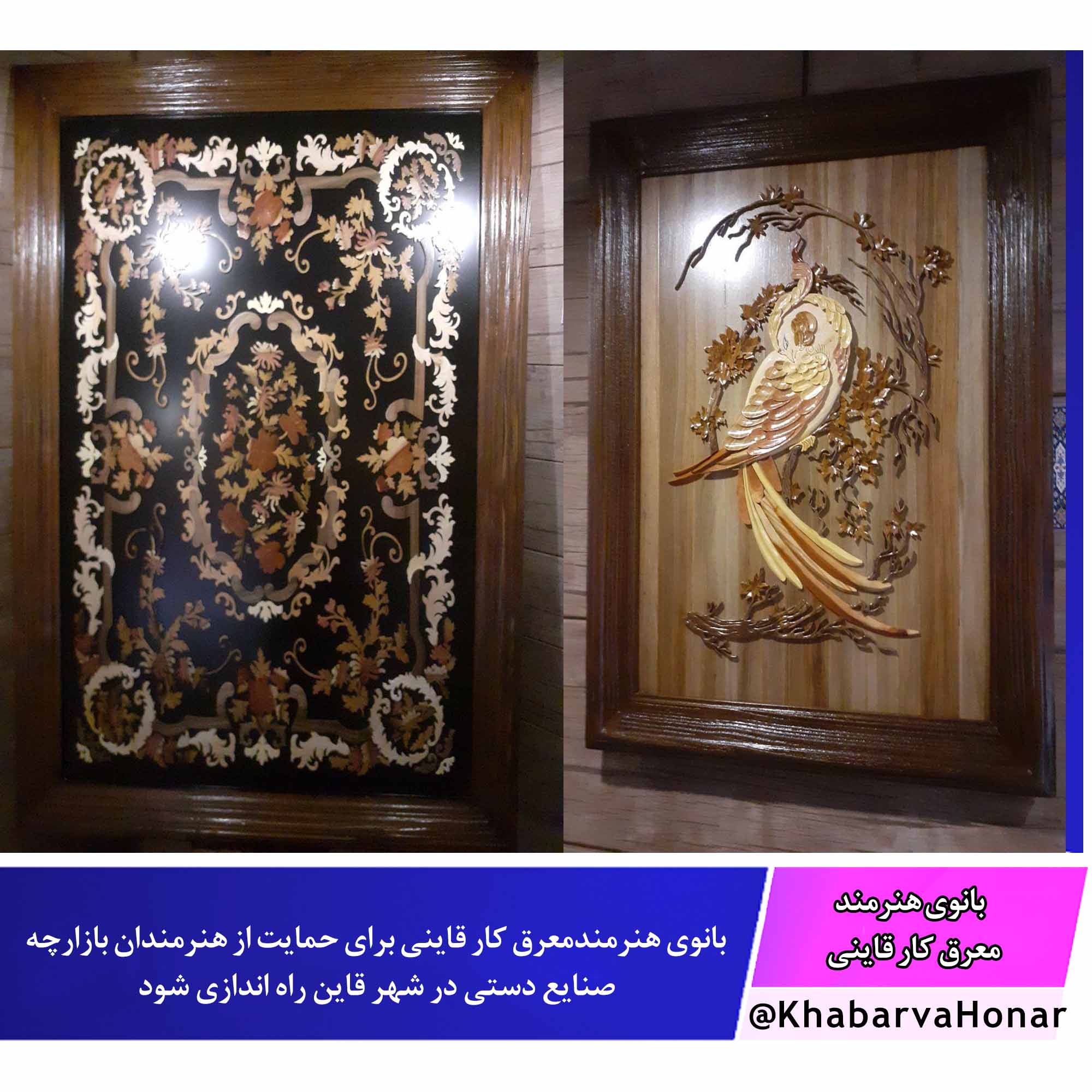 نجمه معاضدی هستم از شهرستان قاین در رشته هنری معرق چوب مشغول کارم ۱۷ ساله معرق کار کردم ولی حدود دوسال که خیلی جدی این هنرو دنبال میکنم در سطح شهر و روستاها هنرمند خوشبختانه زیاد هستند در رشته های مختلف ولی مهم اینکه هنرشون دیده بشه و حمایت بشن که متاسفانه اینطور نیست . در رابطه با هنر معرق هستند کسانی هستندکه کار میکنند ولی در سطح بالا و تعداد بالا و نمایشگاهی کار نمیکنند