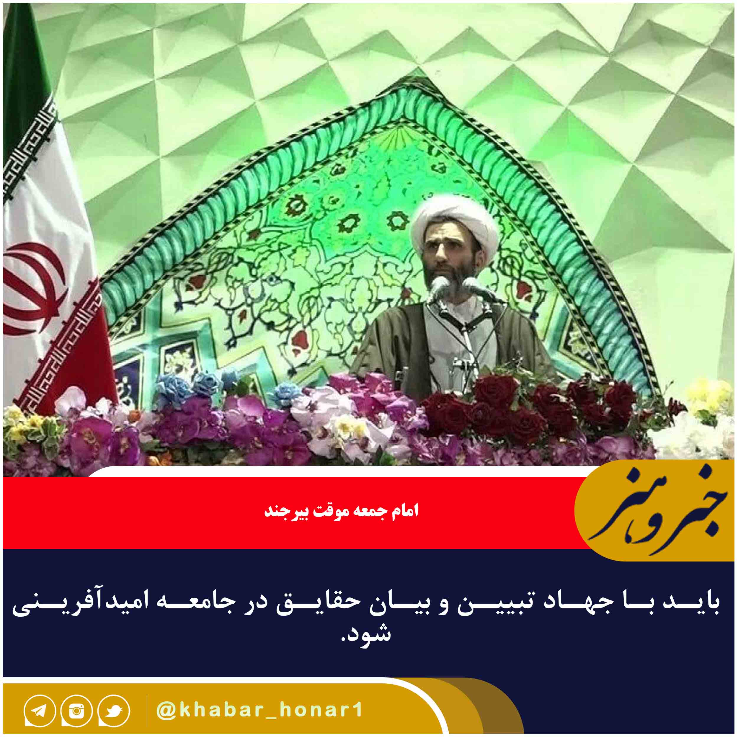 خطیب جمعه بیرجند گفت: همه ما در عرصه جهاد تبیین برای مقابله با تهاجم بیرحمانه دشمنان، مسئولیت داریم که با بیان حقایق، پیشرفتها و دستاوردهای نظام اسلامی در جامعه امیدآفرینی کنیم.