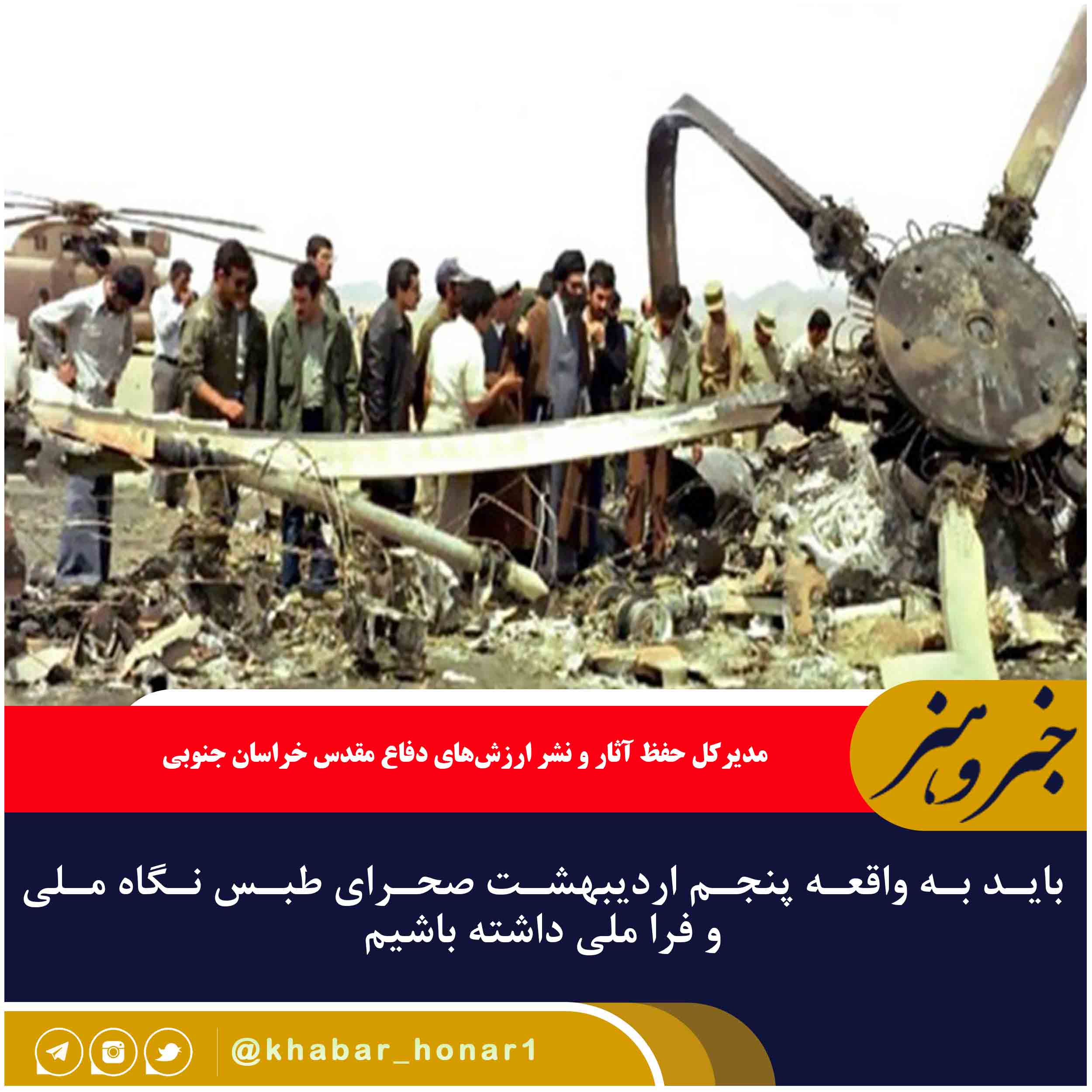 مدیرکل حفظ آثار و نشر ارزش‌های دفاع مقدس خراسان جنوبی گفت: واقعه پنجم اردیبهشت نیاز به جریان سازی دارد و انتظار می‌رود ابعاد شکست حمله نظامی آمریکا به ایران در صحرای طبس از تریبون‌های مختلف تبیین شود.