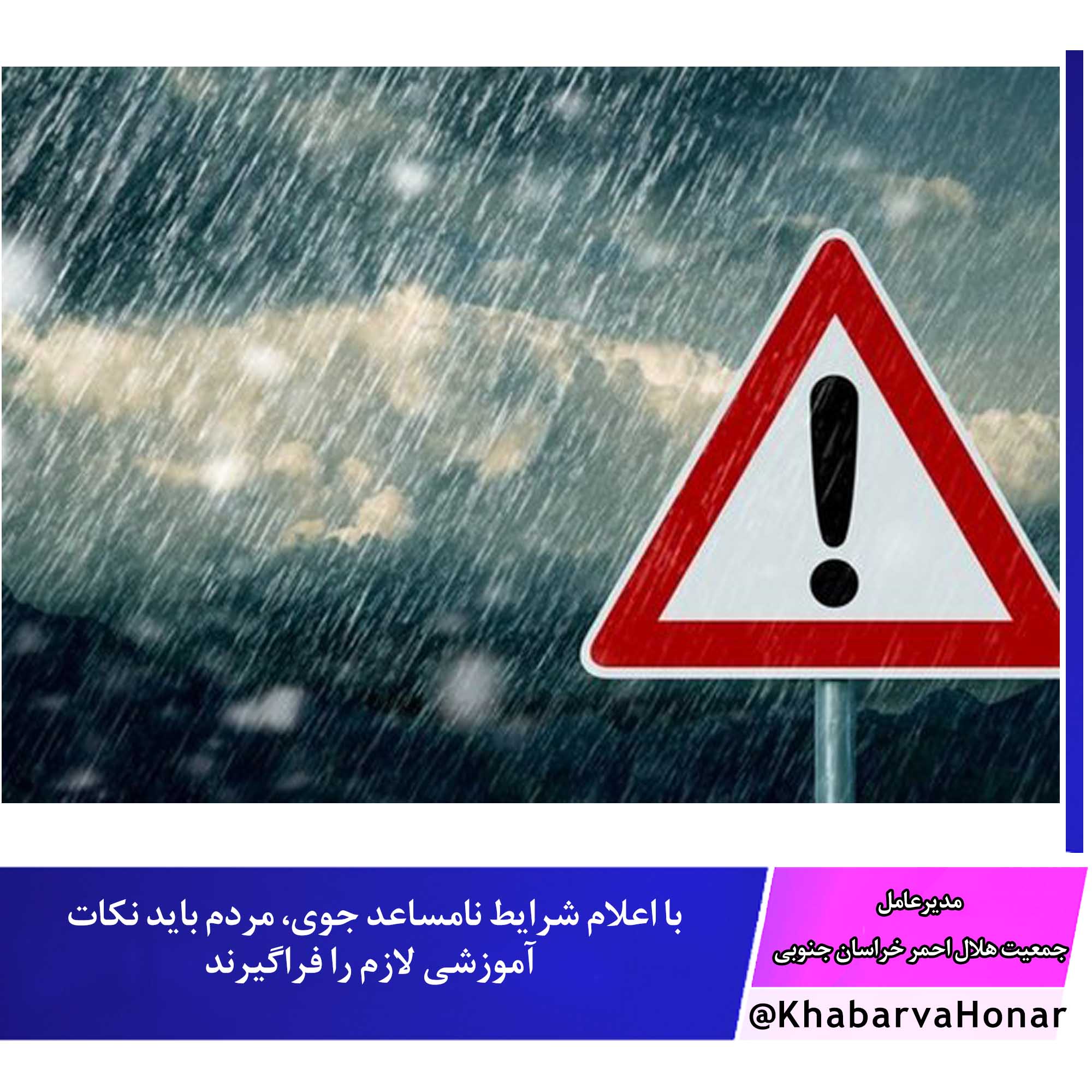 مدیرعامل جمعیت هلال احمر خراسان جنوبی گفت: با اعلام شرایط نامساعد جوی، مردم باید نکات آموزشی لازم را فراگیرند تا در صورت وقوع سیل خسارات و تلفات کمتر شود.