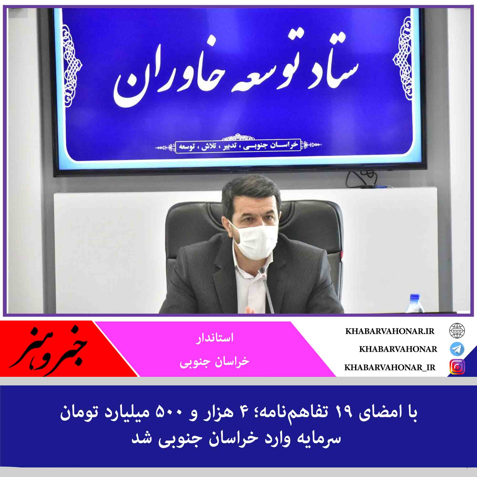 استاندار خراسان جنوبی گفت: از ابتدای شکلگیری ستاد توسعه خاوران تا امروز ۱۹ تفاهمنامه با سرمایهگذاران بخش خصوصی به میزان چهار هزار و ۵۰۰ میلیارد تومان مبادله شده است.