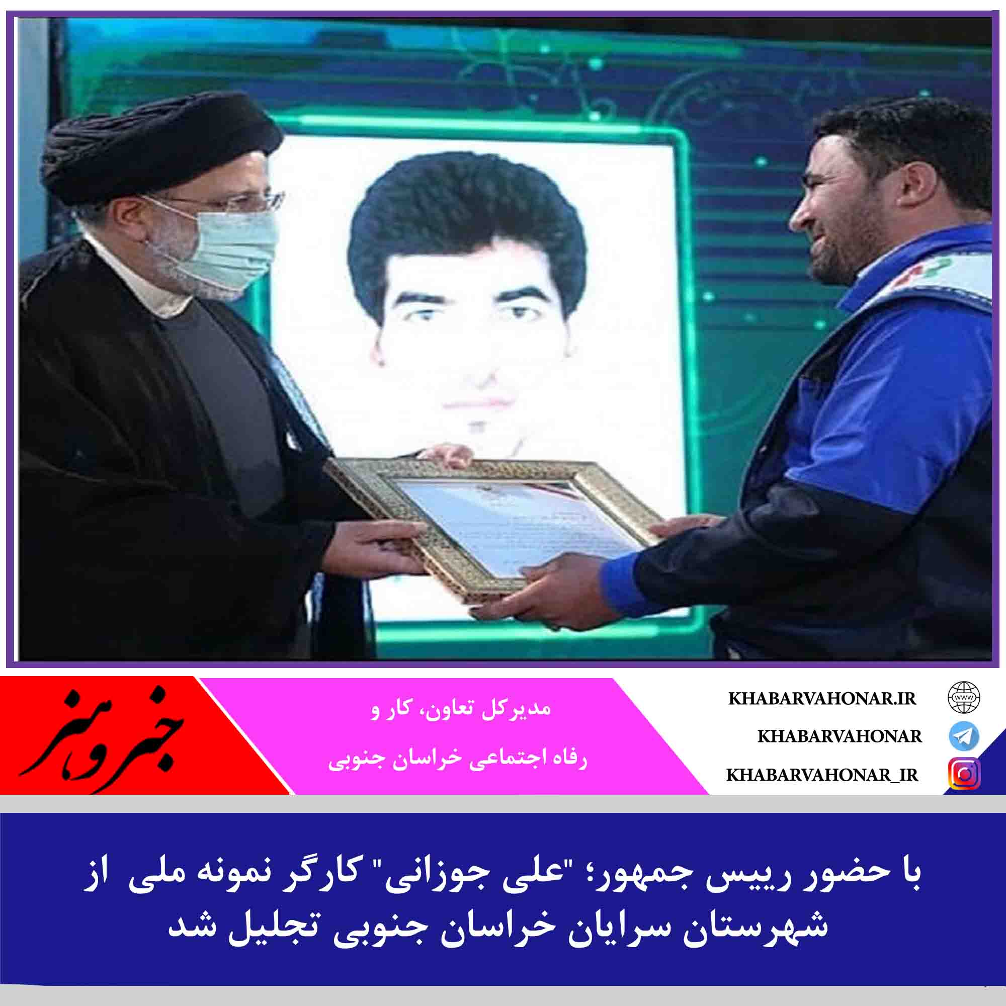 “علی جوزانی” به عنوان کارگر نمونه ملی در رشته جوشکاری درب و پنجره از شهرستان سرایان خراسان جنوبی با دریافت لوح از رییس جمهور در سی و سومین جشنواره ملی امتنان به مناسبت هفته کار و کارگر تجلیل شد.