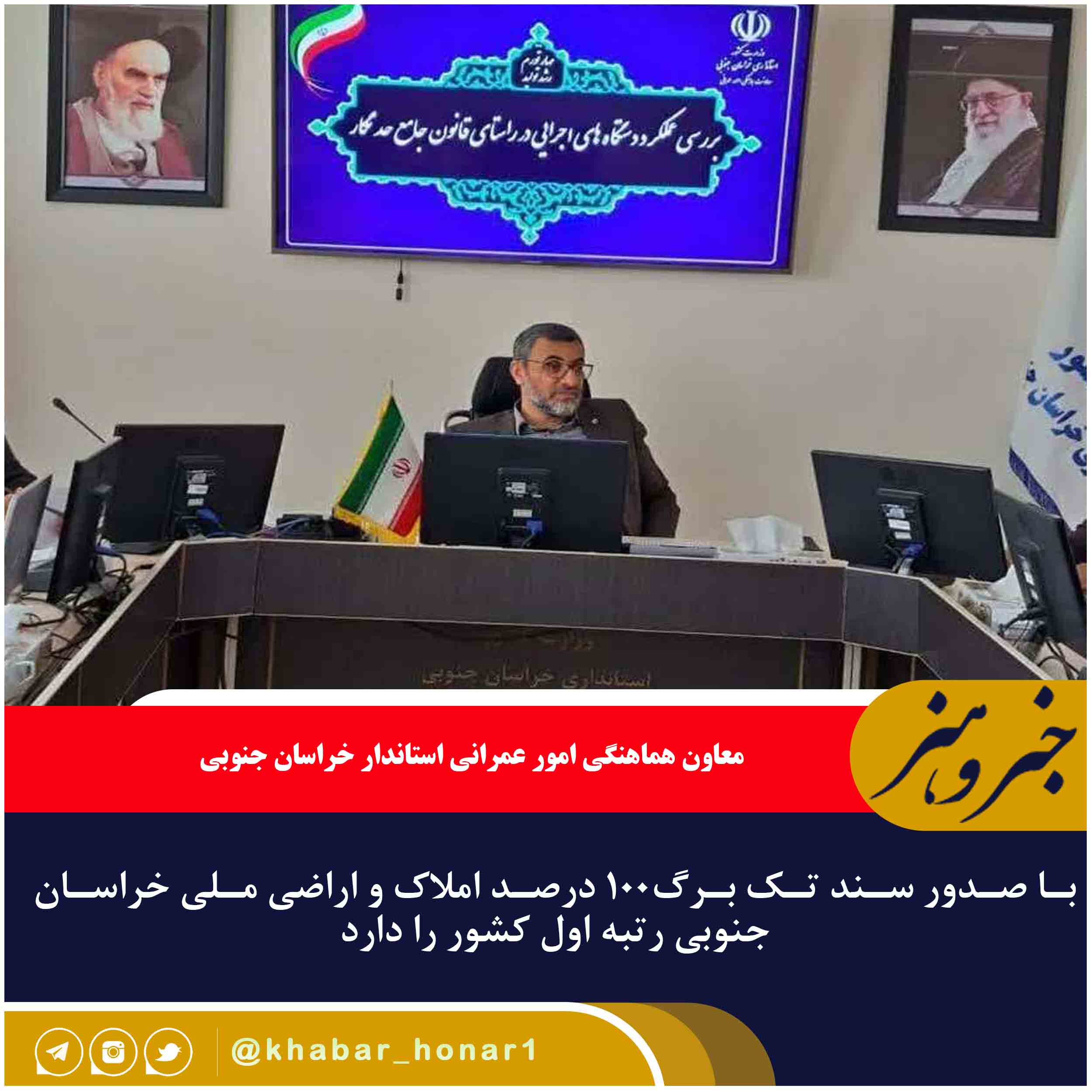 معاون هماهنگی امور عمرانی استاندار خراسان جنوبی گفت: اسناد تک برگ برای ۱۰۰ درصد املاک ملی خراسان جنوبی با همکاری اداره کل منابع طبیعی و آبخیزداری استان صادر شده است و در این زمینه رتبه اول کشور را کسب کردهایم.