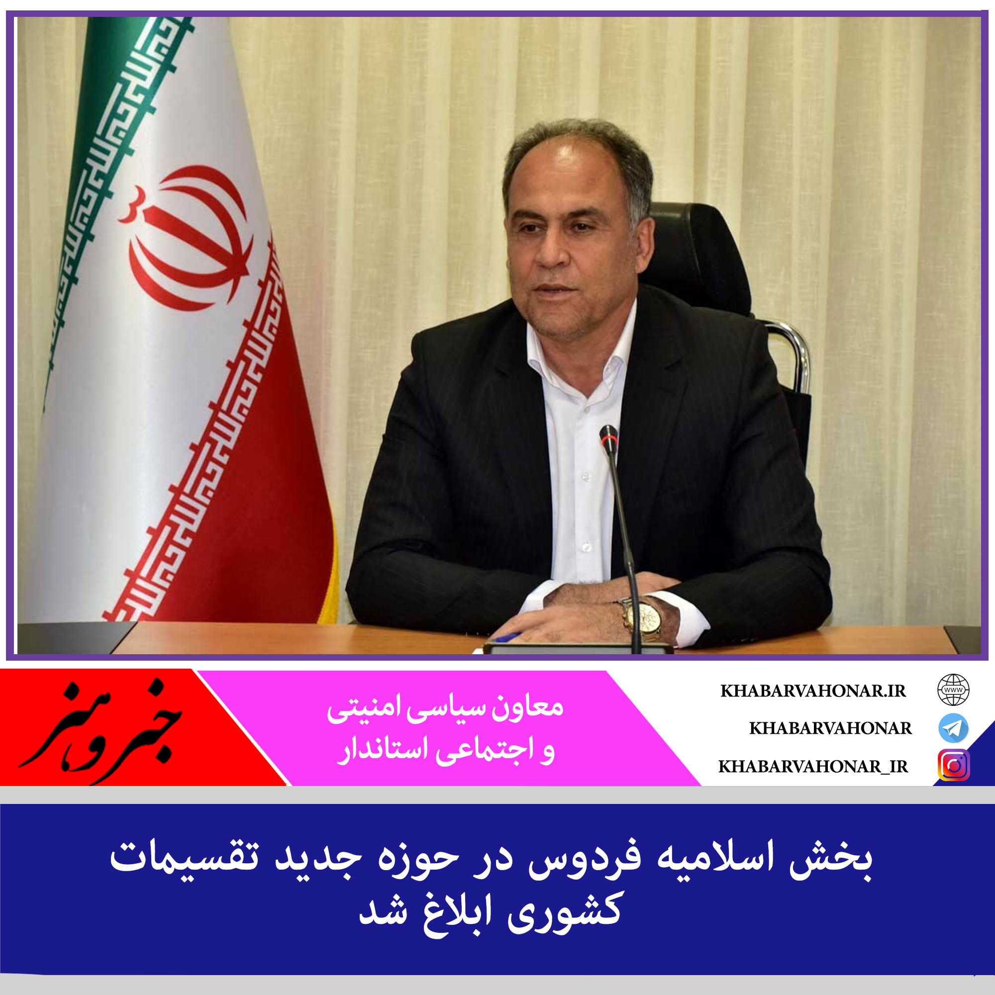 معاون سیاسی امنیتی و اجتماعی استاندار در نامه ای، ابلاغیه جدید وزارت کشور در خصوص تغییرات جدید صورت گرفته در حوزه تقسیمات کشوری شهرستان فردوس را به دستگاه های اجرایی استان اعلام کرد.
