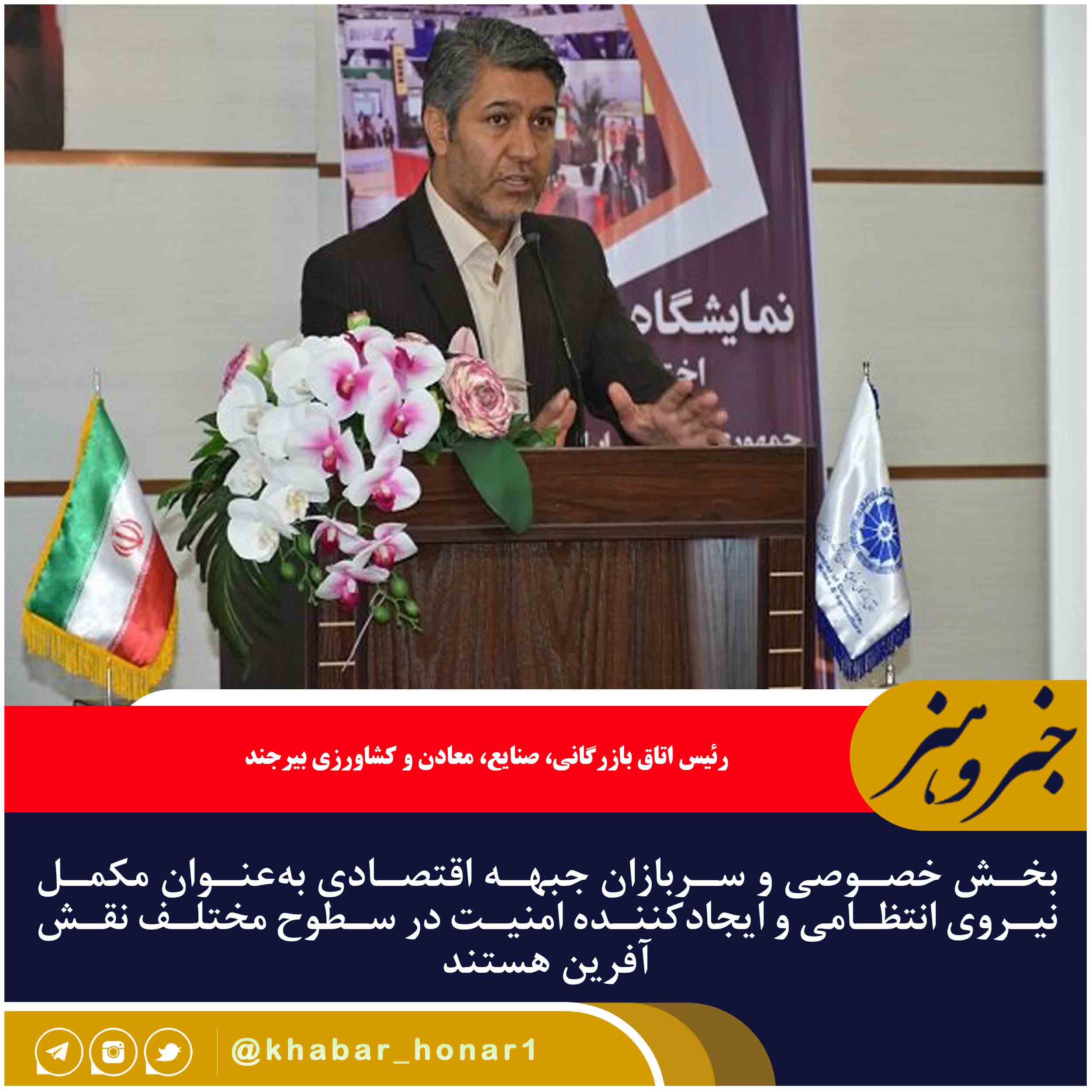 رئیس اتاق بازرگانی، صنایع، معادن و کشاورزی بیرجند گفت: بخش خصوصی و سربازان جبهه اقتصادی بهعنوان مکمل نیروی انتظامی و ایجادکننده امنیت در سطوح مختلف نقش آفرین هستند.