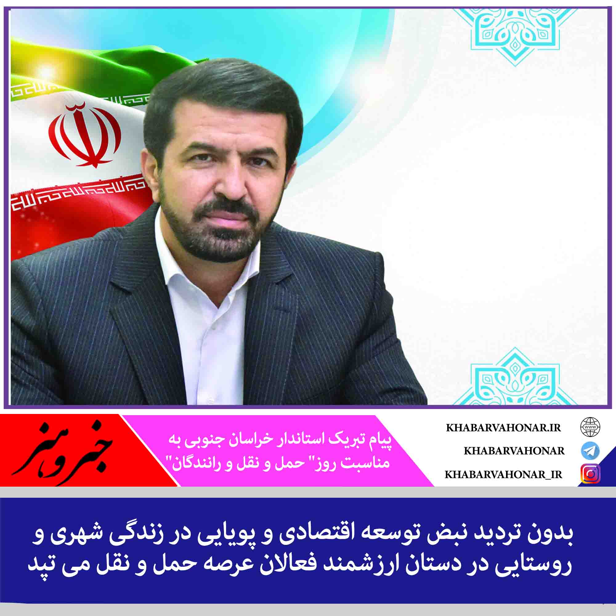 اینجانب ضمن تبریک ۲۶ آذرماه “روز حمل و نقل و رانندگان” به همه هم استانی های عزیز، با استفاده از همین فرصت از زحمات تمامی دست اندکاران و فعالان این عرصه به ویژه همکاران اداره راهداری و حمل و نقل جاده ای، راهداران عزیز و رانندگان شریف استان قدردانی کرده از درگاه حضرت باریتعالی برای همگان سلامت و موفقیت مسئلت دارم.