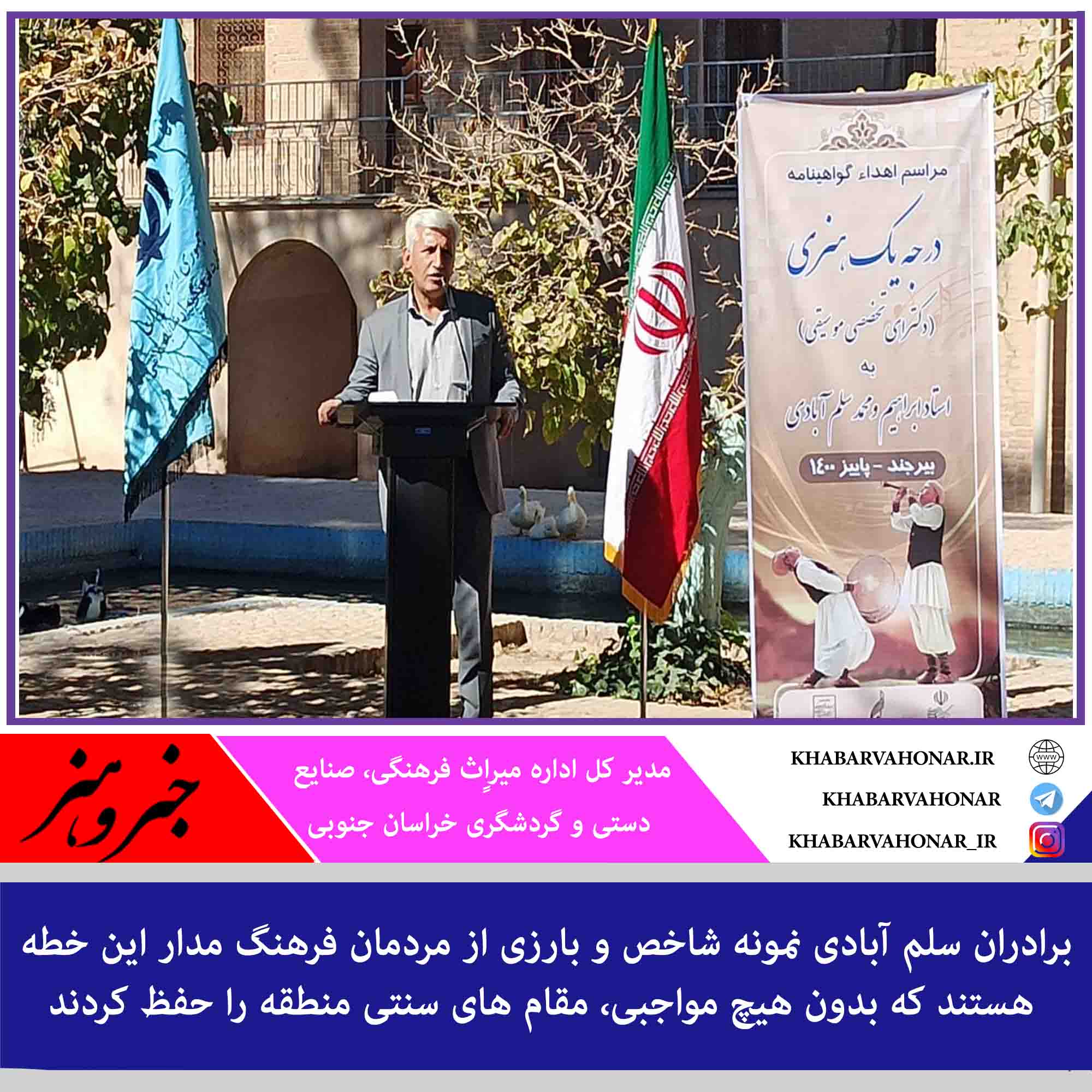 مدیر کل اداره میراٍث فرهنگی، صنایع دستی و گردشگری خراسان جنوبی گفت: برادران سلم آبادی نمونه شاخص و بارزی از مردمان فرهنگ مدار این خطه هستند که بدون هیچ مواجبی، مقام های سنتی منطقه را حفظ کردند.