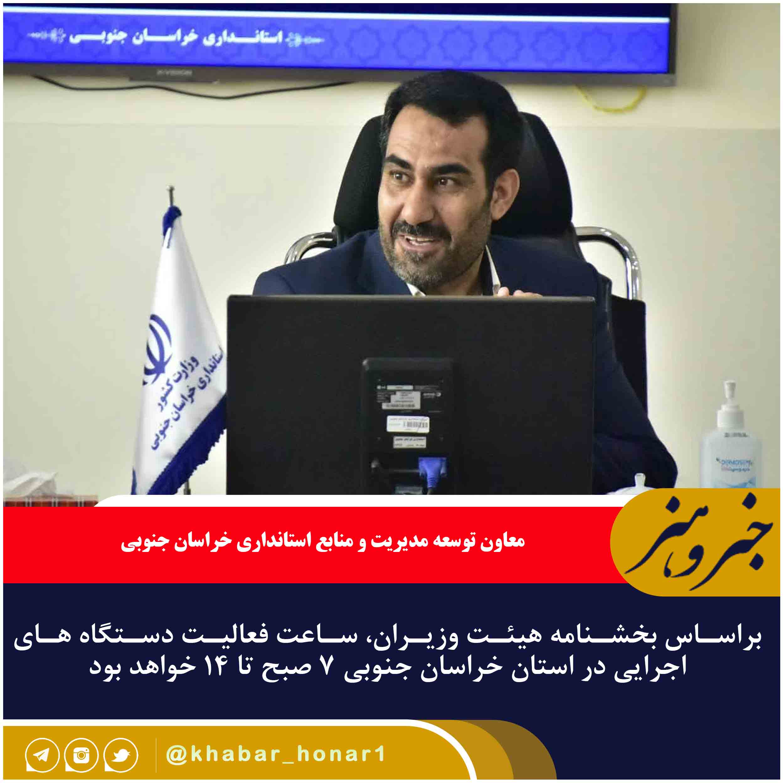 ?وی تصریح کرد: براساس بخشنامه هیئت وزیران، ساعت فعالیت دستگاه های اجرایی در استان خراسان جنوبی ۷ صبح تا ۱۴ خواهد بود.