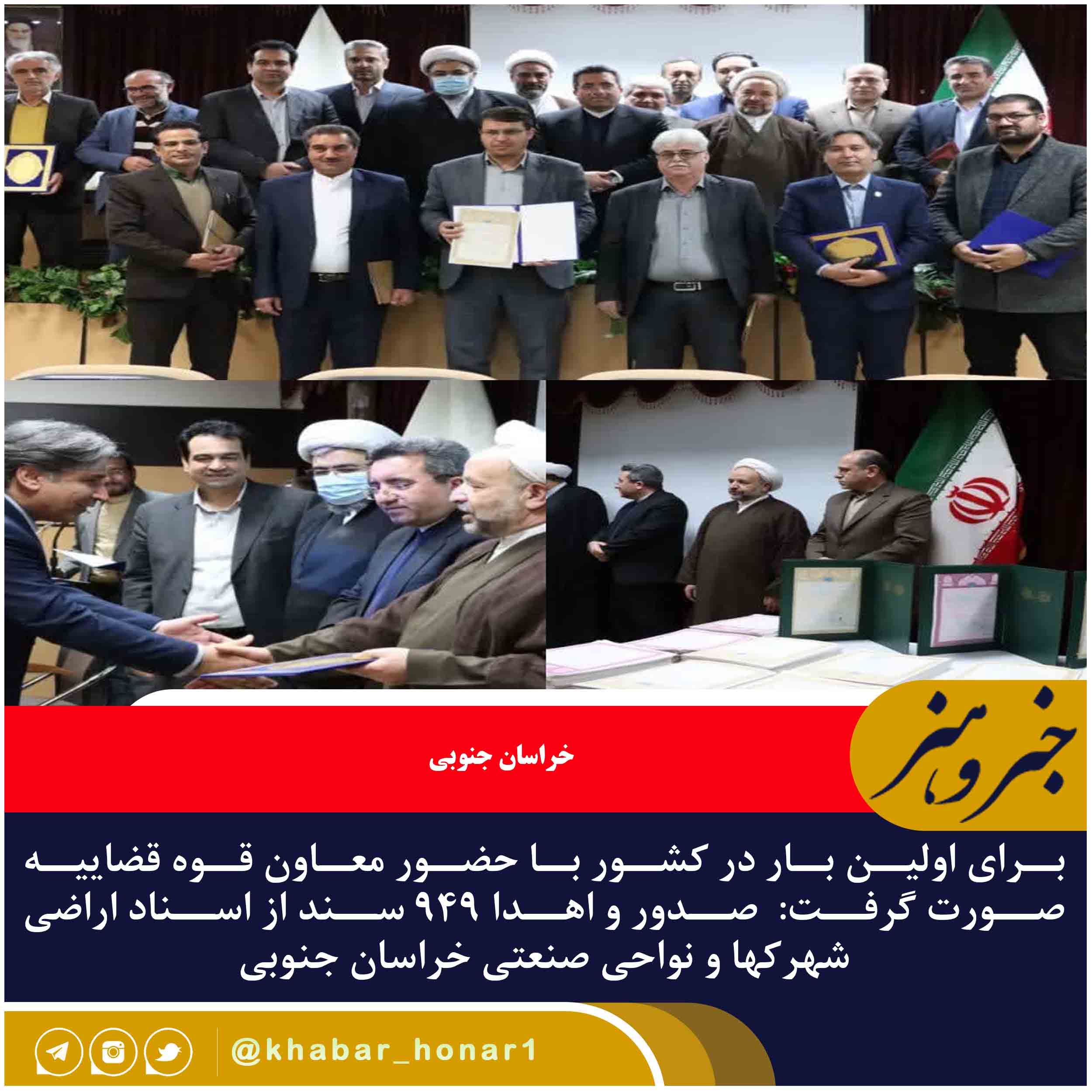 برای اولین بار در کشور مراسم اهدا ۹۴۹ سند از اسناد اراضی شهرک ها و نواحی صنعتی خراسان جنوبی با حضور معاون قوه قضاییه و مقام عالی سازمان ثبت و اسناد کشور ، مدیرعامل شرکت شهرکهای صنعتی خراسان جنوبی و رئیس کل دادگستری استان و جمعی از مدیران ارشد استانی برگزار شد.