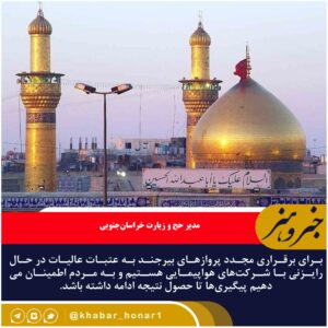 مدیرکل فرودگاههای خراسانجنوبی بیان کرد: به هر حال مشکلاتی در برقراری این پروازها وجود داشته که بعد از ماه مبارک رمضان تاکنون انجام نشده، اما به مردم اطمینان میدهیم که آمادگی کامل برای برقراری مجدد پرواز عتبات از فرودگاه بیرجند را داریم.