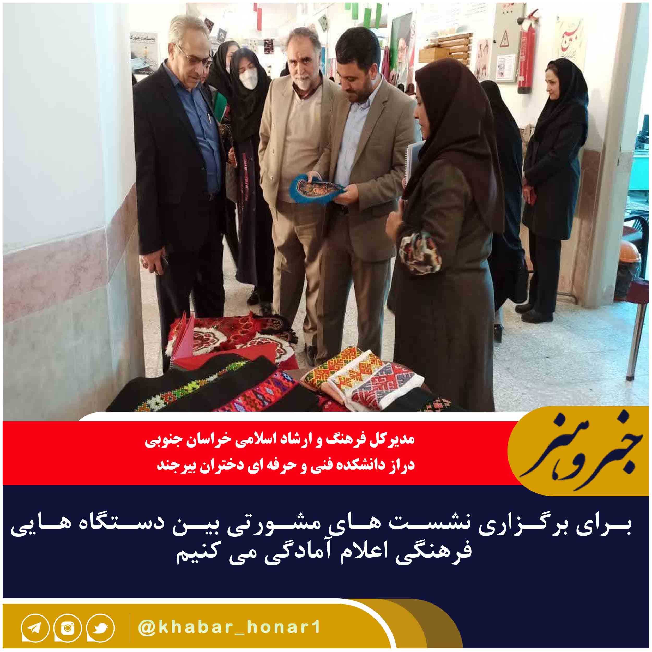 علی فرخنده، مدیرکل فرهنگ و ارشاد اسلامی خراسان جنوبی با هدف آشنایی با ظرفیت های هنری دانشجویان، از دانشکده فنی و حرفه ای دختران بیرجند (سپیده کاشانی) بازدید کرد.