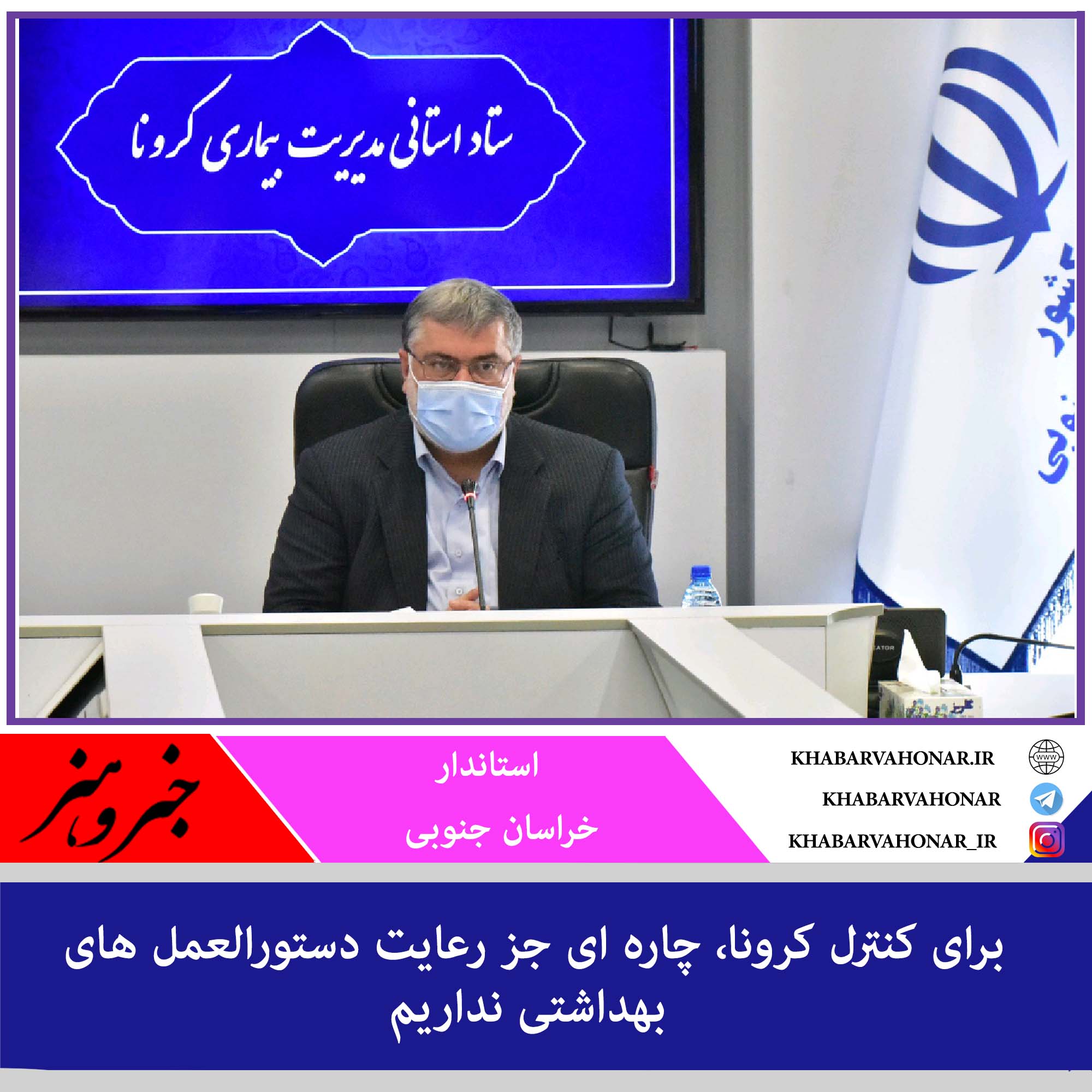 ?استاندار خراسان جنوبی گفت: برای کنترل بیماری و قطع کردن زنجیره شیوع کرونا، چاره ای جز رعایت دستورالعمل های بهداشتی نداریم.