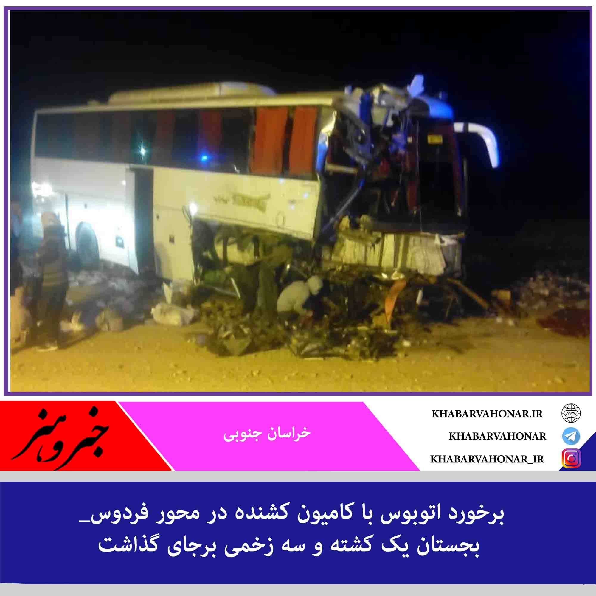 ?برخورد اتوبوس با کامیون کشنده در محور فردوس_ بجستان یک کشته و سه زخمی برجای گذاشت.
