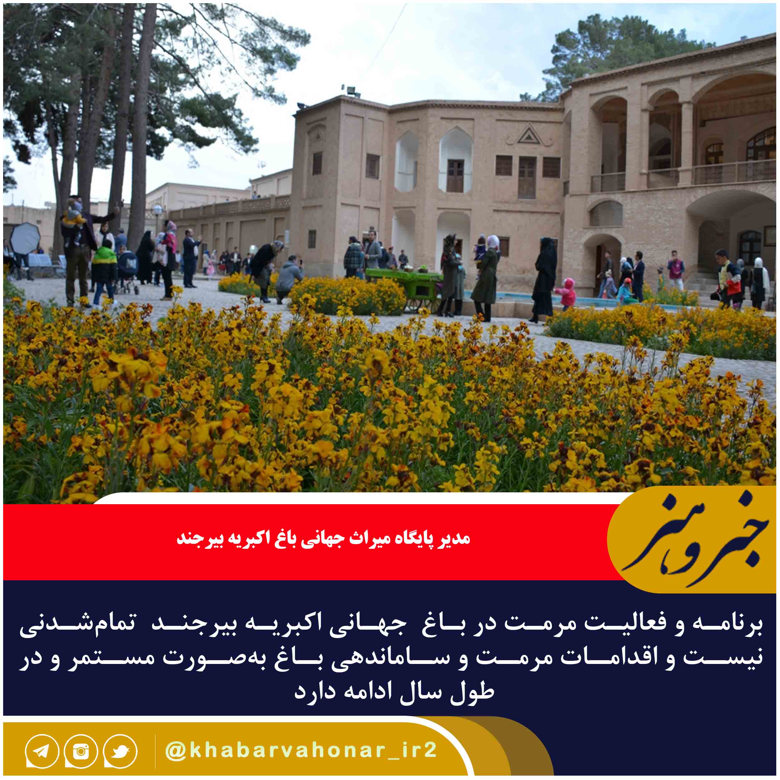 مدیر پایگاه میراث جهانی باغ اکبریه بیرجند گفت: برنامه و فعالیت مرمت در باغ جهانی اکبریه بیرجند تمامشدنی نیست و اقدامات مرمت و ساماندهی باغ بهصورت مستمر و در طول سال ادامه دارد.