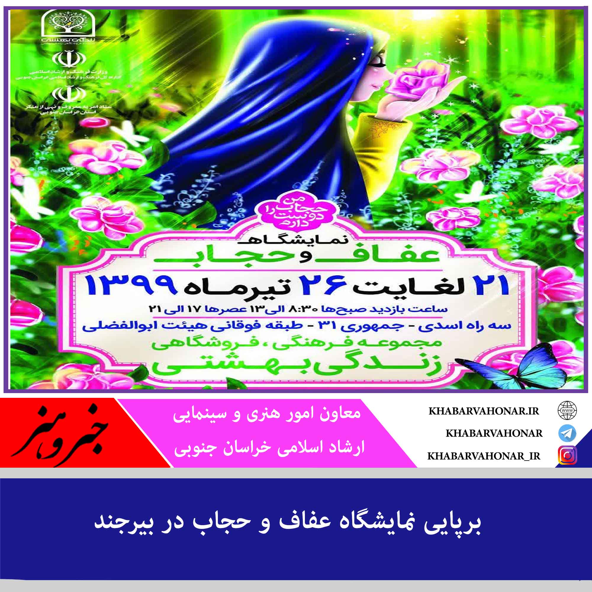 معاون امور هنری و سینمایی اداره کل فرهنگ و ارشاد اسلامی خراسان جنوبی از برگزاری مراسم افتتاحیه نمایشگاه عفاف و حجاب، ساعت ۱۱ روز شنبه ۲۱ تیرماه ۹۹ خبر داد.سید علی زمزم با بیان این خبر , عنوان کرد: این نمایشگاه ۲۱ لغایت ۲۶ تیرماه ۹۹ برپا خواهد بود. وی با بیان این که محل برگزاری نمایشگاه سه راه اسدی، جمهوری ۳۱ ، طبقه فوقانی هیئت ابوالفضلی، می باشد، خاطرنشان کرد: علاقه مندان می توانند صبح ها ۸:۳۰ الی ۱۳ و عصرها ۱۷ الی ۲۱ از این نمایشگاه بازدید بعمل آورند.