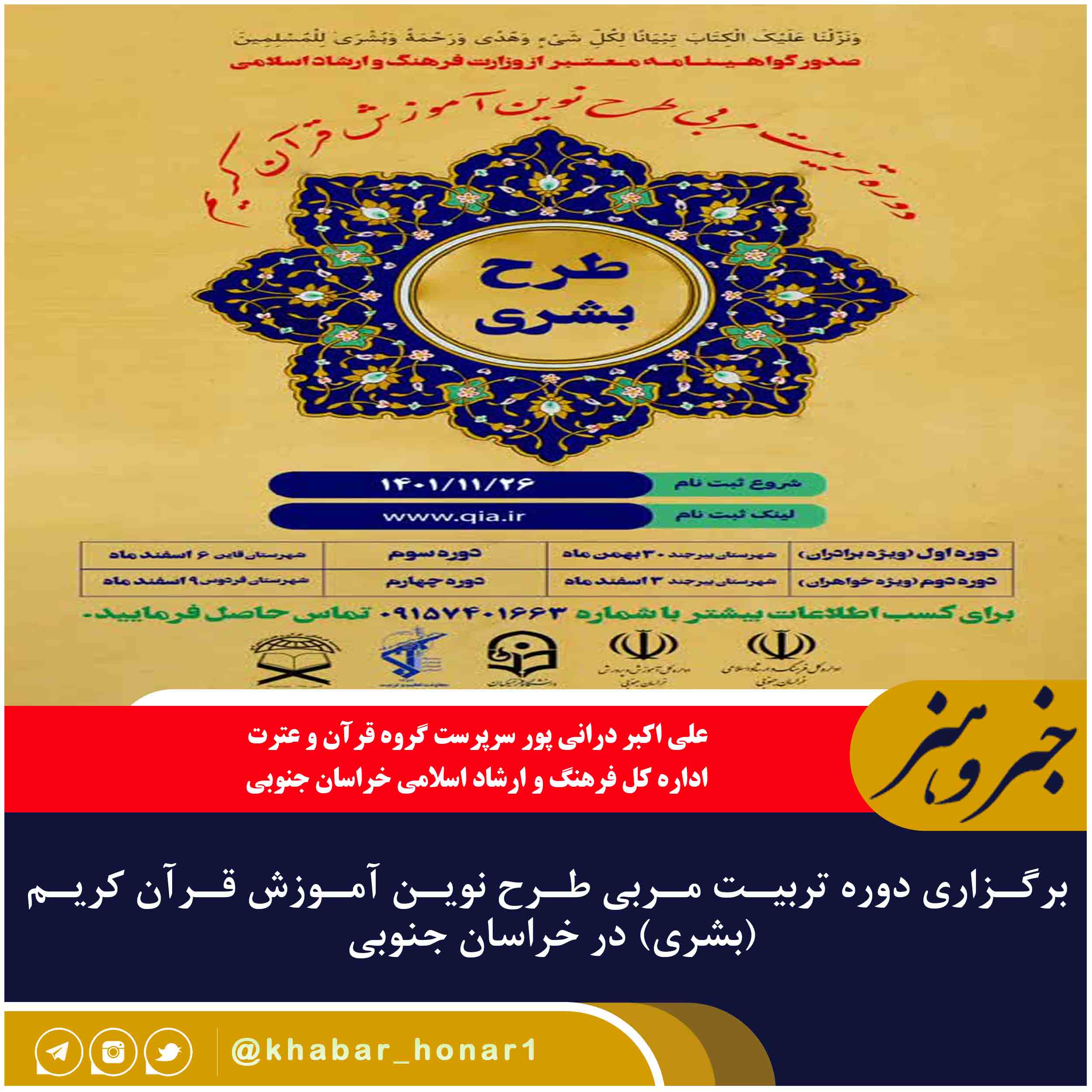 ، علی اکبر درانی پور عنوان کرد: دوره تربیت مربی بشری (طرح نوین آموزش قرآن کریم) طی دو دوره در شهرستان بیرجند ویژه برادران و خواهران، یک دوره در فردوس و یک دوره در قاینات» برگزار می گردد.