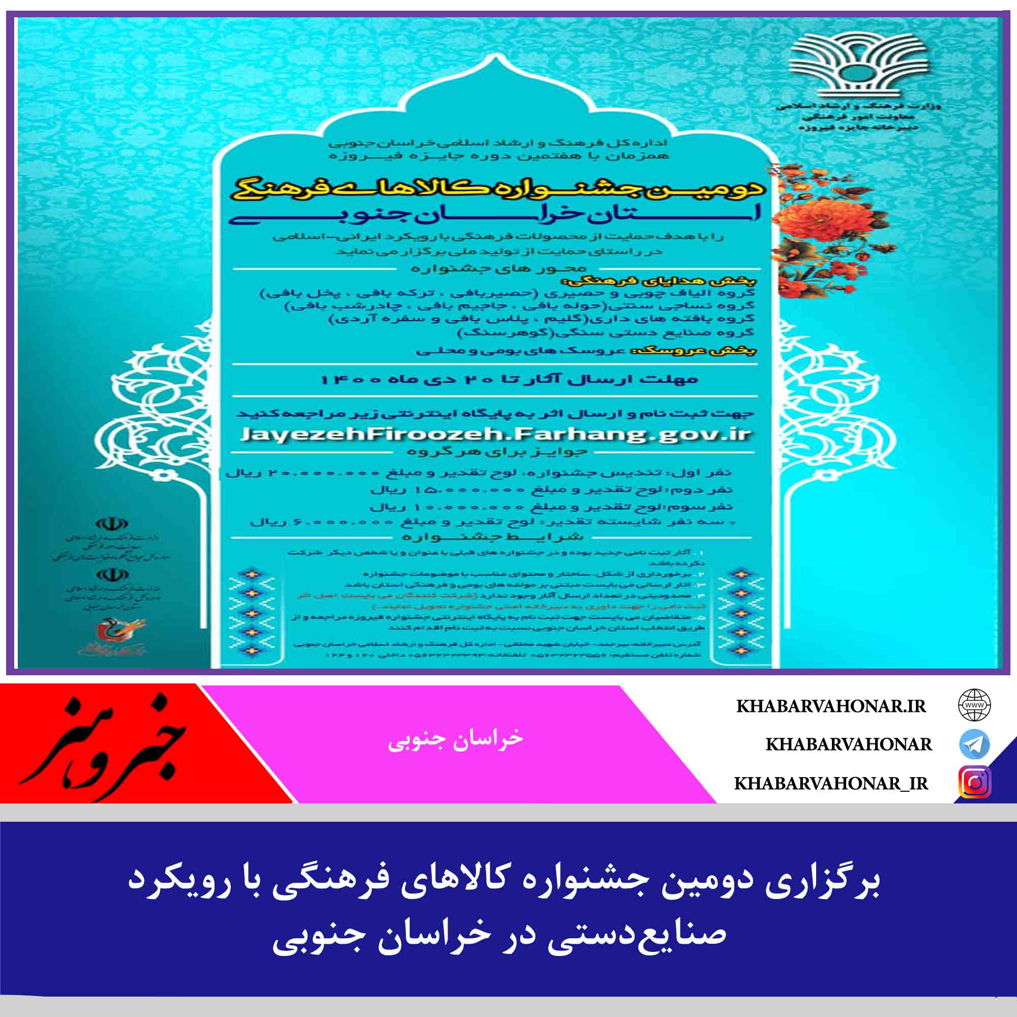 ?سرپرست معاونت صنایعدستی و هنرهای سنتی استان گفت: همزمان با هفتمین دوره جایزه فیروزه، دومین جشنواره کالاهای فرهنگی استان خراسانی جنوبی، با همکاری ادارهکل فرهنگ و ارشاد اسلامی و ادارهکل میراثفرهنگی، گردشگری و صنایعدستی استان باهدف حمایت از محصولات فرهنگی با رویکرد ایرانی – اسلامی در راستای حمایت از تولید ملی برگزار میشود.