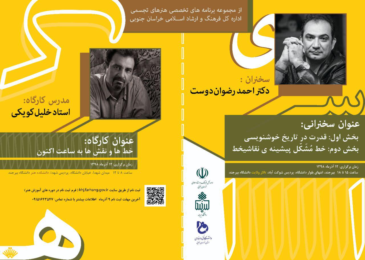 سخنرانی علمی تخصصی قدرت در تاریخ خوشنویسی و خط مُشَکّل پیشینه ی نقاشیخط با حضور دکتر احمد رضوان دوست و ورک شاپ خطها و نقشها به ساعت اکنون با حضور استاد خلیل کویکی