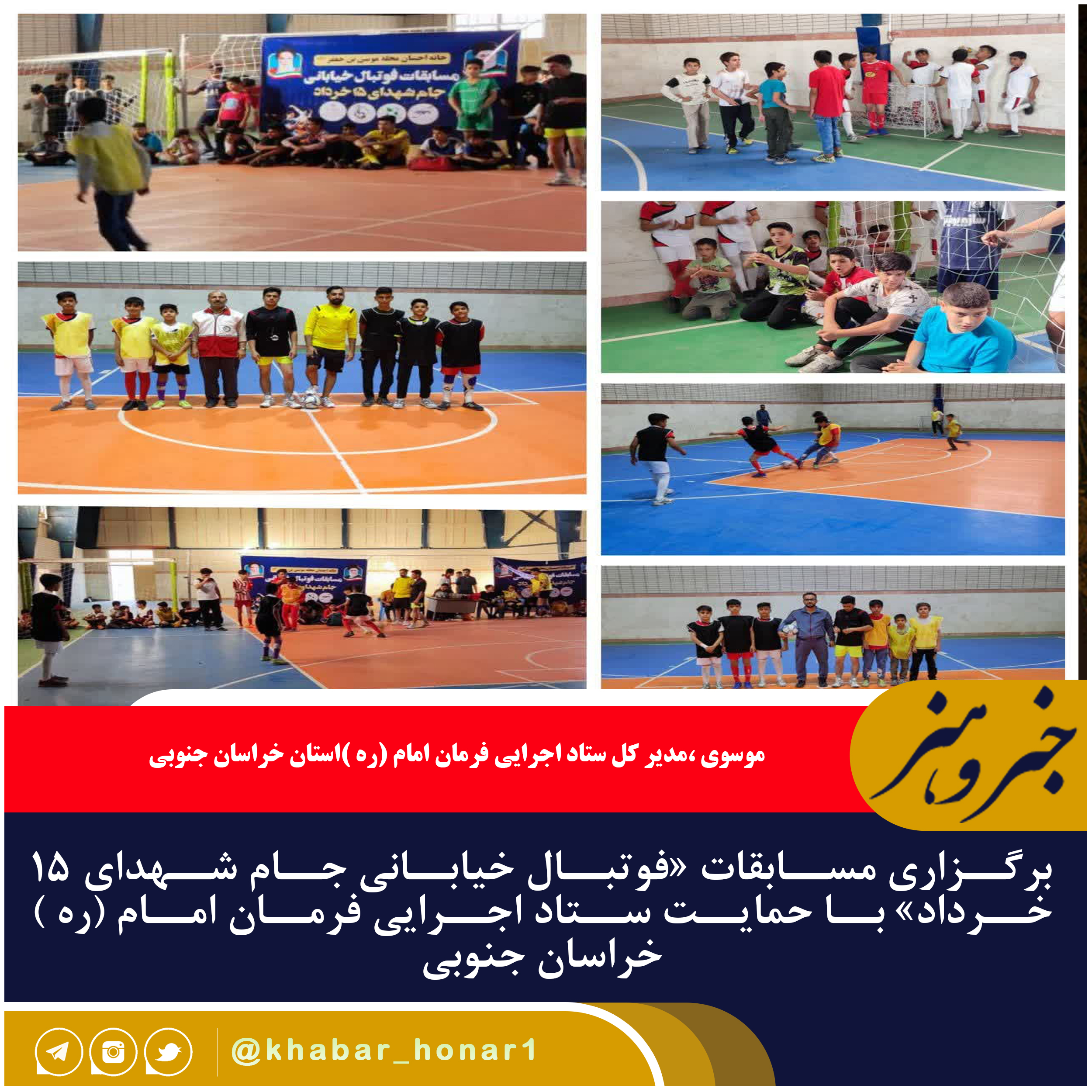 موسوی ،مدیر کل ستاد اجرایی فرمان امام (ره )استان خراسان جنوبی، از برگزاری مسابقات «فوتبال خیابانی جام شهدای ۱۵ خرداد» در سطح استان با حمایت قرارگاه تحول وتوانمندسازی محلات ستاد اجرایی خبر داد.