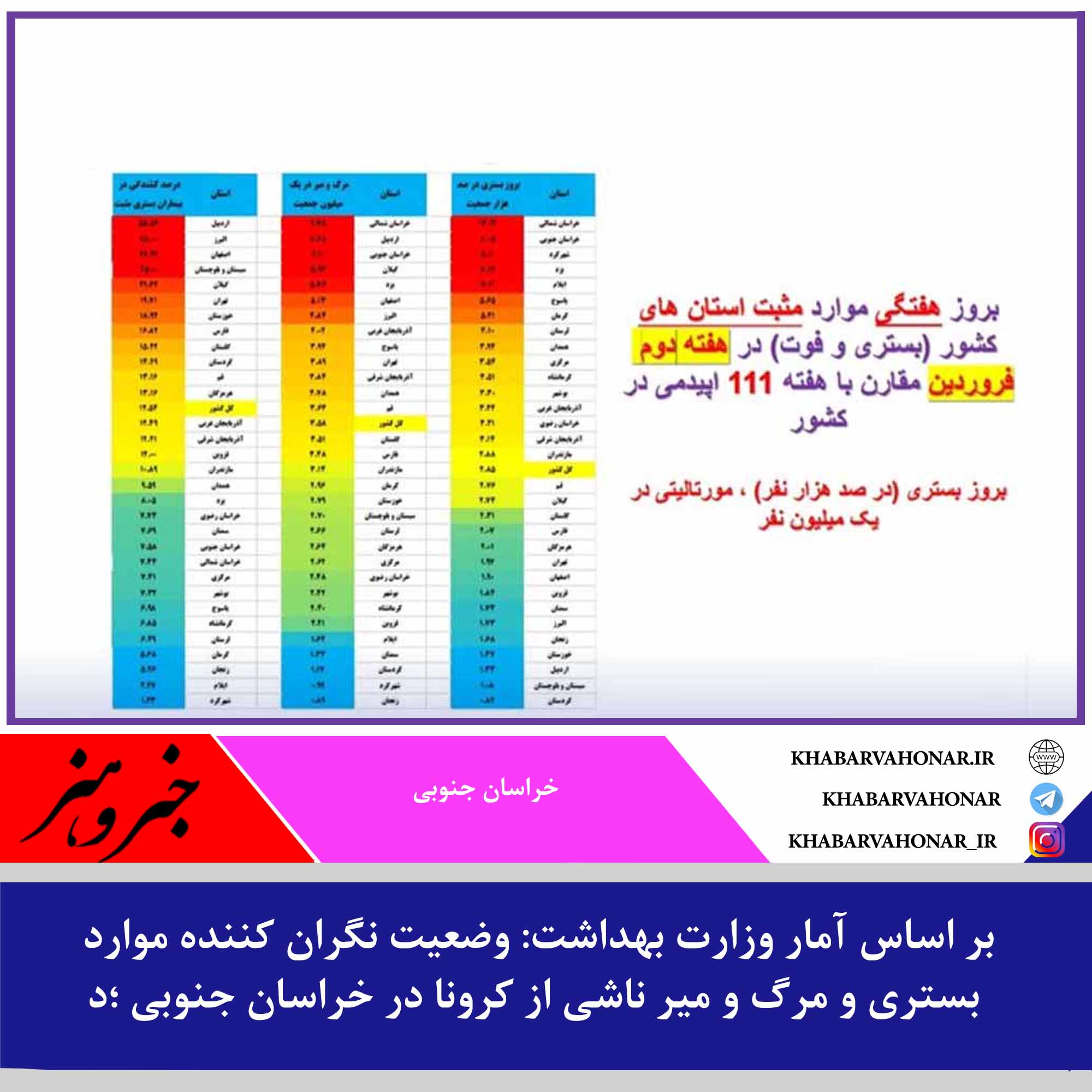 ?بر اساس اعلام وزارت بهداشت در هفته ۱۱۱ همهگیری کووید ۱۹، ((در هفته دوم فروردین ماه ۱۴۰۱)) خراسان جنوبی رتبه دوم بروز بستری و سوم مرگ میر کرونا در کشور را دارد
