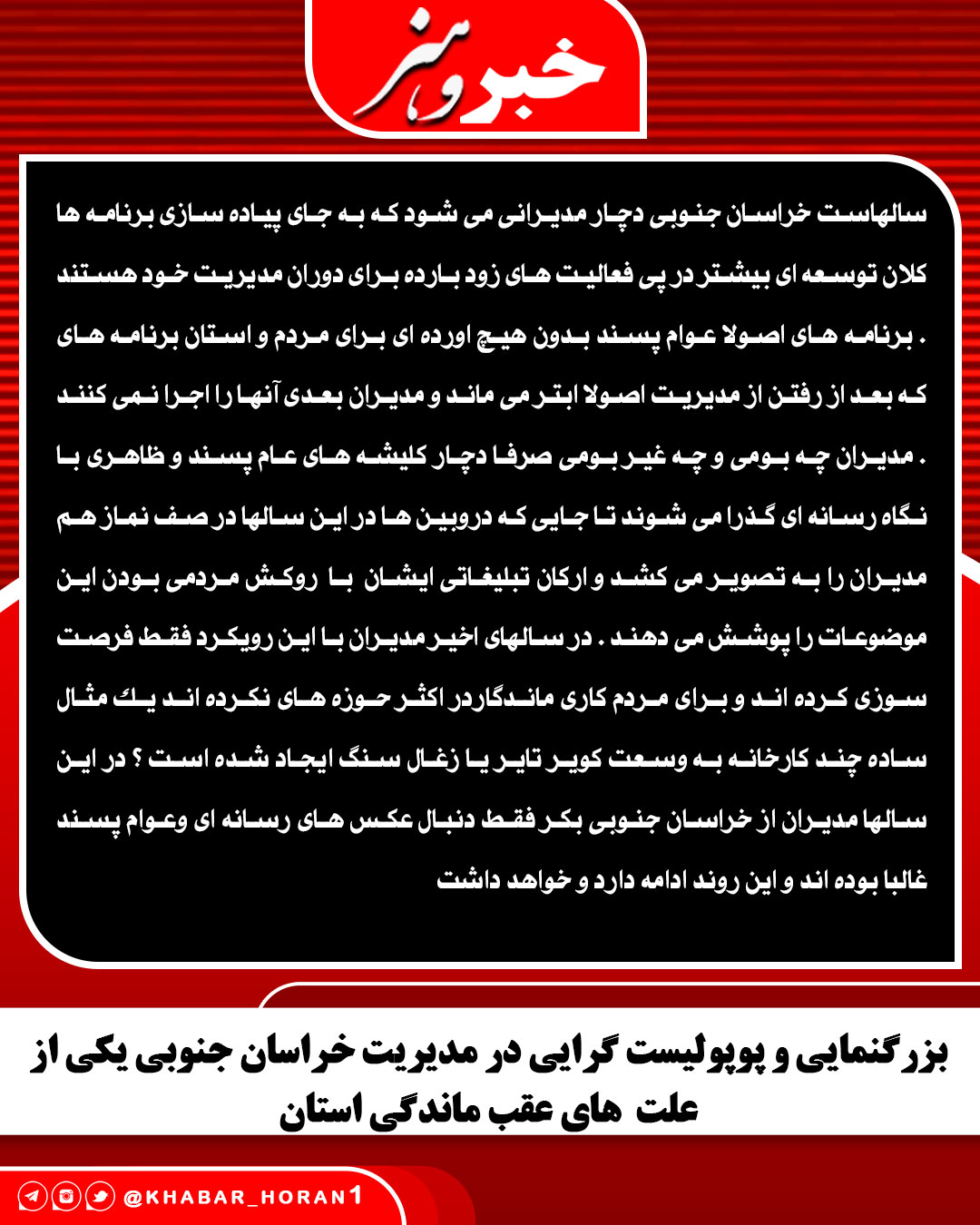 سالهاست خراسان جنوبی دچار مدیرانی می شود که به جای پیاده سازی برنامه ها کلان توسعه ای بیشتر در پی فعالیت های زود بارده برای دوران مدیریت خود هستند . برنامه های اصولا عوام پسند بدون هیچ اورده ای برای مردم و استان برنامه های که بعد از رفتن از مدیریت اصولا ابتر می ماند و مدیران بعدی آنها را اجرا نمی کنند . مدیران چه بومی و چه غیر بومی صرفا دچار کلیشه های عام پسند و ظاهری با نگاه رسانه ای گذرا می شوند تا جایی که دروبین ها در این سالها در صف نماز هم مدیران را به تصویر می کشد و ارکان تبلیغاتی ایشان با روکش مردمی بودن این موضوعات را پوشش می دهند . در سالهای اخیر مدیران با این رویکرد فقط فرصت سوزی کرده اند و برای مردم کاری ماندگاردر اکثر حوزه های نکرده اند یک مثال ساده چند کارخانه به وسعت کویر تایر یا زغال سنگ ایجاد شده است ؟ در این سالها مدیران از خراسان جنوبی بکر فقط دنبال عکس های رسانه ای وعوام پسند غالبا بوده اند و این روند ادامه دارد و خواهد داشت