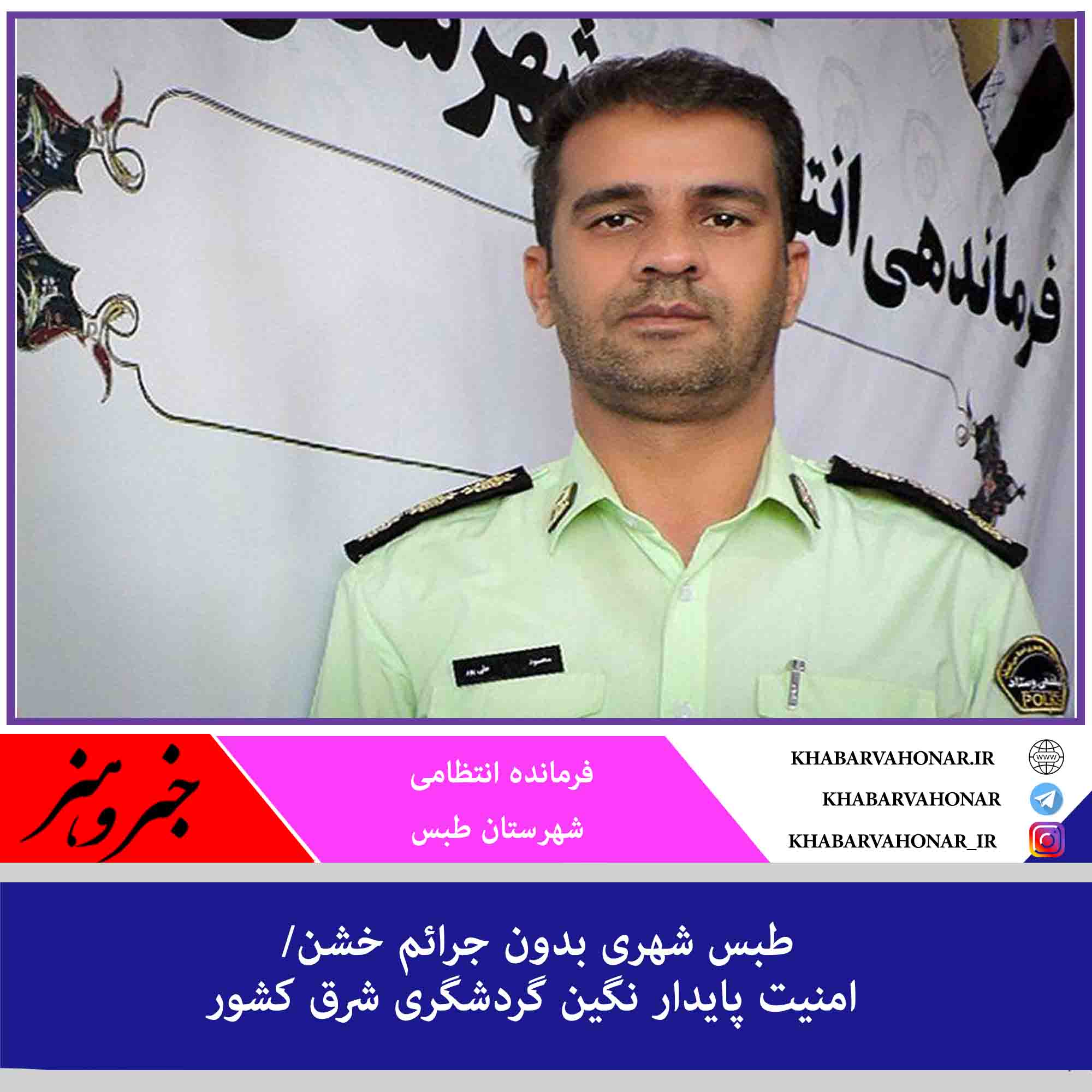 سرهنگ علی پور فرمانده نیروی انتظامی شهرستان طبس گفت: با تلاش کارکنان پلیس و همکاری مردم دارالمومنین شهرستان طبس در ۶ ماهه ابتدایی سال جاری هیچ جرم خشنی در این شهرستان به وقوع نپیوسته است و امنیتی پایدار در این شهرستان حاکم است.