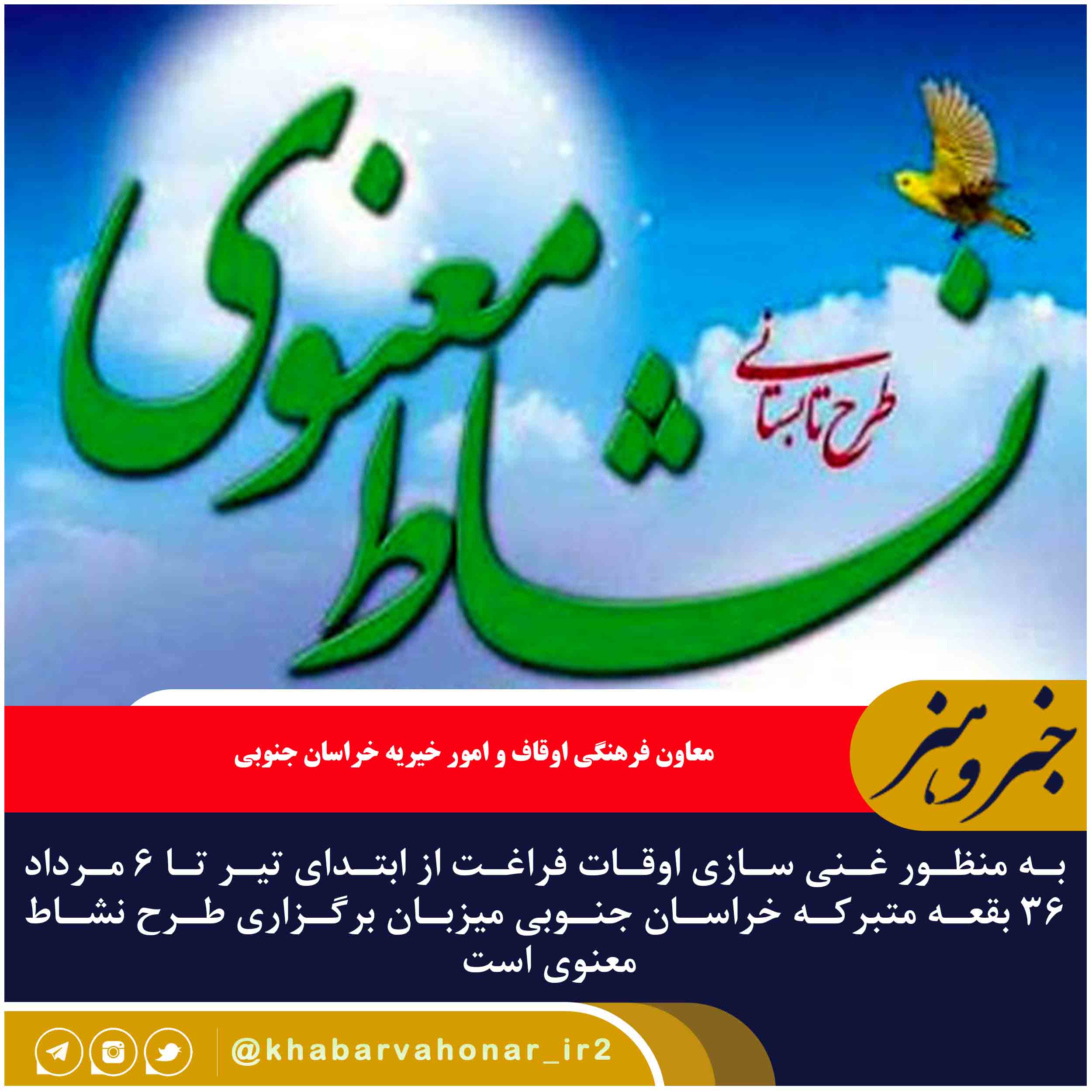 به منظور غنی سازی اوقات فراغت از ابتدای تیر تا ۶ مرداد ۳۶ بقعه متبرکه خراسان جنوبی میزبان برگزاری طرح نشاط معنوی است .