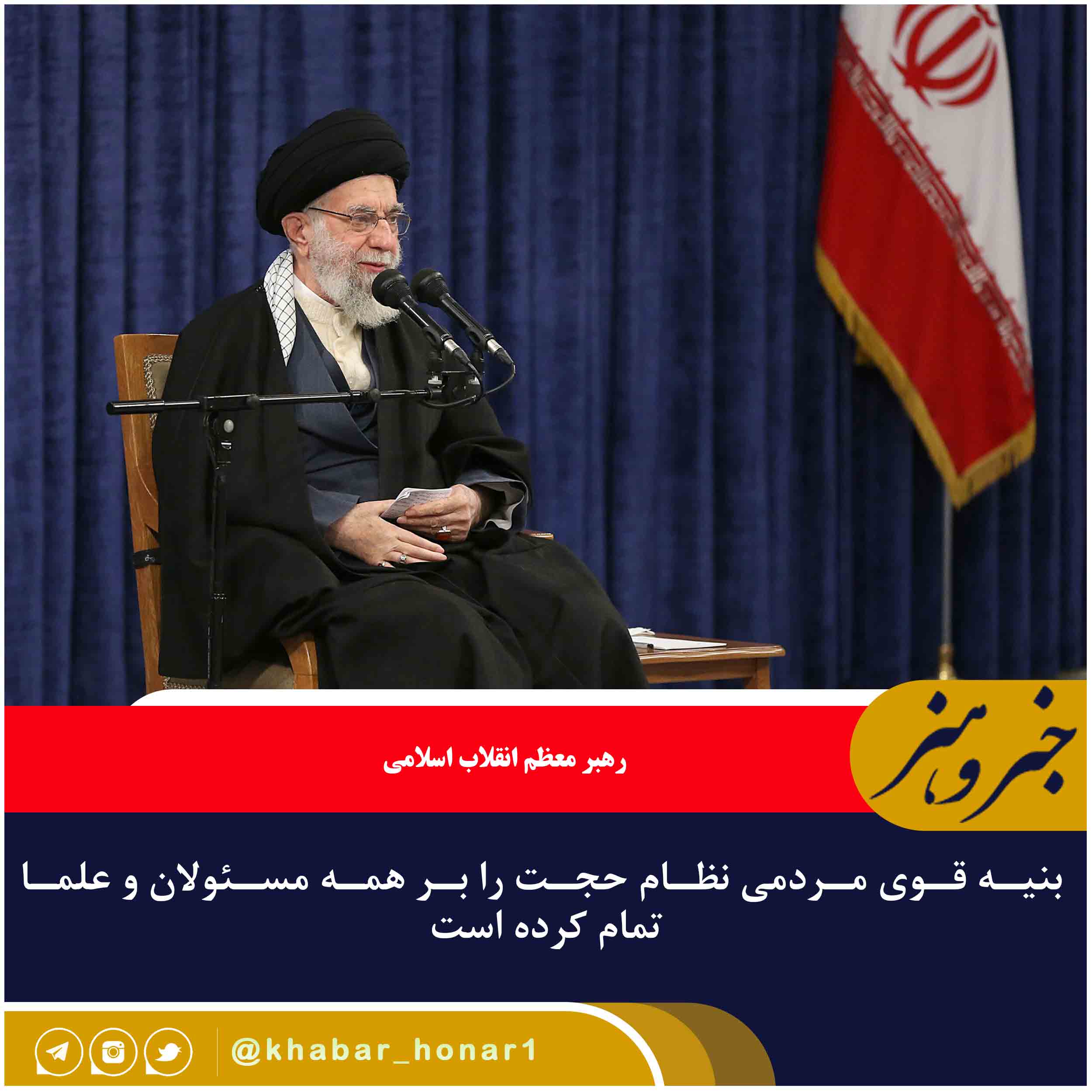 حضرت آیتالله خامنهای، شأن دوم اعضای مجلس خبرگان را «شأن علمایی» آنها برشمردند و گفتند: بنیه مردمیِ قوی جمهوری اسلامی و ارتباط و اتکاء مردم و نظام به یکدیگر، ثروتی ملی، حقیقتی غیرقابل کتمان و بینظیر یا لااقل کمنظیر در دنیا است که جلوههای آن در ماجرای کرونا و به میدان آمدن مردم، کمکهای مؤمنانه و همچنین حضور و تلاشهای مردم در کمک به آسیبدیدگان حوادث طبیعی حقیقتاً حیرتانگیز است.