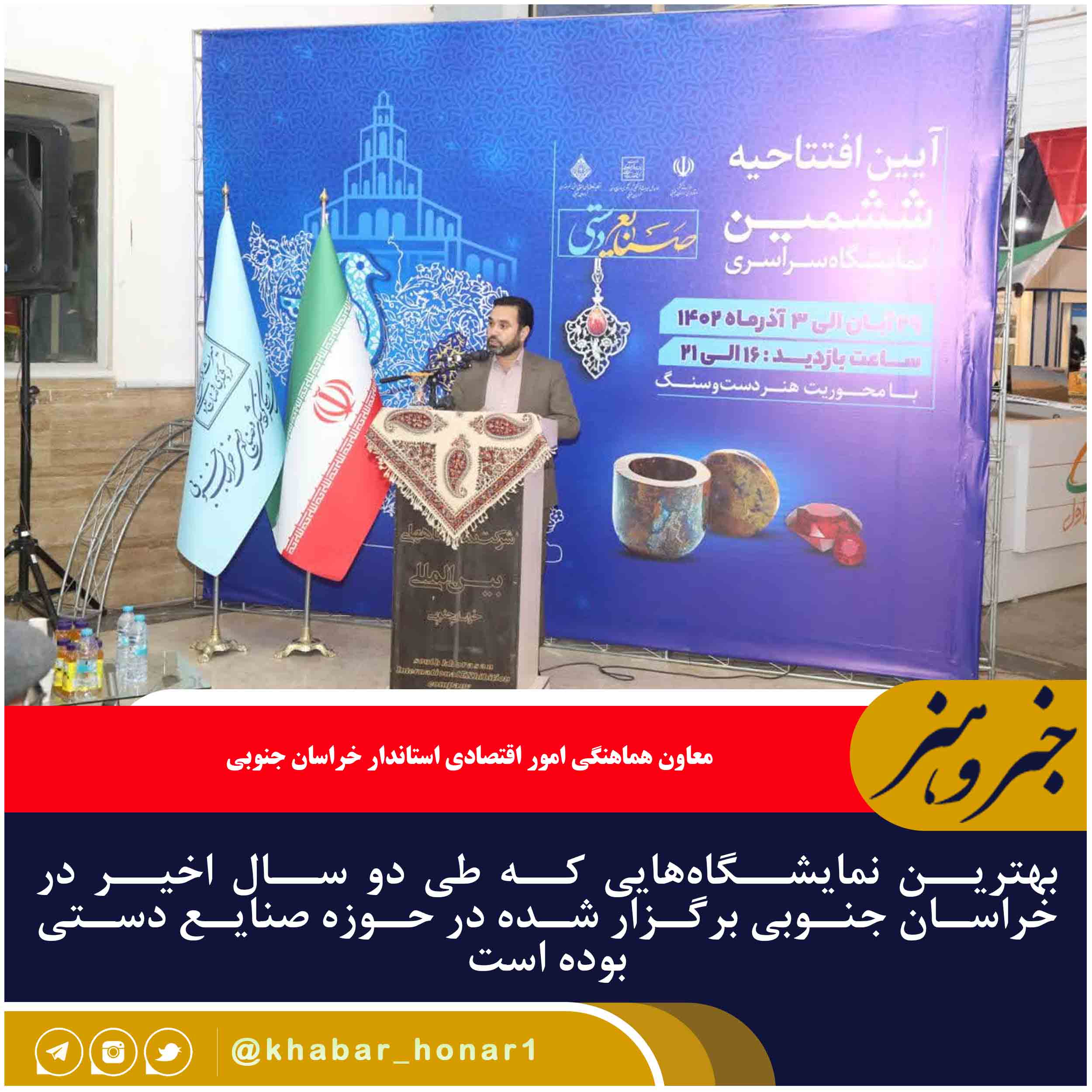 اشرفی با بیان اینکه نمایشگاه خراسانجنوبی در آینده از نمایشگاههای بنام در سطح ملی خواهد بود، تصریح کرد: این نمایشگاه نشانی در حوزه صنایع دستی جمهوری اسلامی خواهد بود تا سهمی در اقتصاد مردمی و ارزش افزوده خوبی در سبد معیشتی مردم ایجاد کند.عاون هماهنگی امور اقتصادی استاندار خراسان جنوبی گفت: