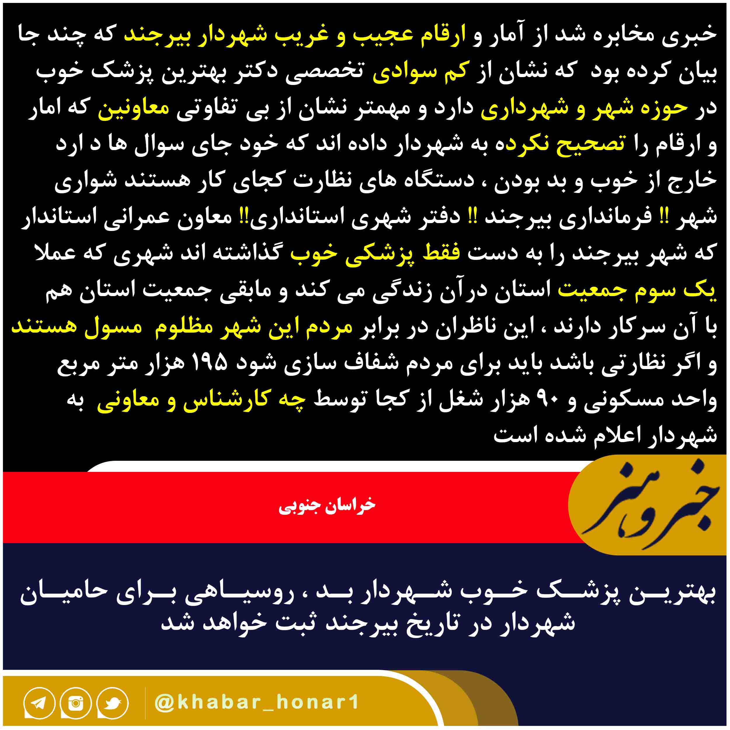 خبری مخابره شد از آمار و ارقام عجیب و غریب شهردار بیرجند که چند جا بیان کرده بود که نشان از کم سوادی تخصصی دکتر بهترین پزشک خوب در حوزه شهر و شهرداری دارد و مهمتر نشان از بی تفاوتی معاونین که امار و ارقام را تصحیح نکرده به شهردار داده اند که خود جای سوال ها د ارد خارج از خوب و بد بودن ، دستگاه های نظارت کجای کار هستند شواری شهر !! فرمانداری بیرجند !! دفتر شهری استانداری!! معاون عمرانی استاندار که شهر بیرجند را به دست فقط پزشکی خوب گذاشته اند شهری که عملا یک سوم جمعیت استان درآن زندگی می کند و مابقی جمعیت استان هم با آن سرکار دارند ، این ناظران در برابر مردم این شهر مظلوم مسول هستند و اگر نظارتی باشد باید برای مردم شفاف سازی شود ۱۹۵ هزار متر مربع واحد مسکونی و ۹۰ هزار شغل از کجا توسط چه کارشناس و معاونی به شهردار اعلام شده است