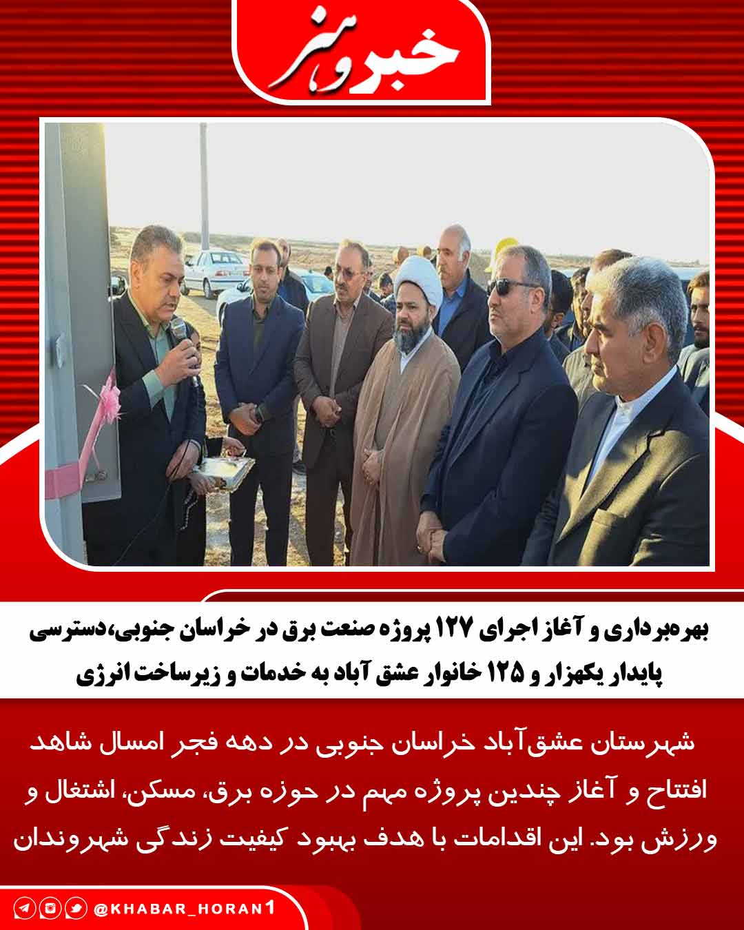 به گزارش خبر و هنر خراسان جنوبی در ششمین روز از دهه فجر با حضور استاندار خراسان جنوبی، امام جمعه، فرماندار و جمعی از مدیران استانی و شهرستان عشق آباد همزمان پروژههای تامین برق خانوارهای روستایی، اصلاح و بهینهسازی شبکههای برق، نصب سامانههای خورشیدی عشایر، افتتاح واحدهای مسکن مددجویی و روستایی و بهرهبرداری از طرحهای هادی در روستاها انجام شد.
