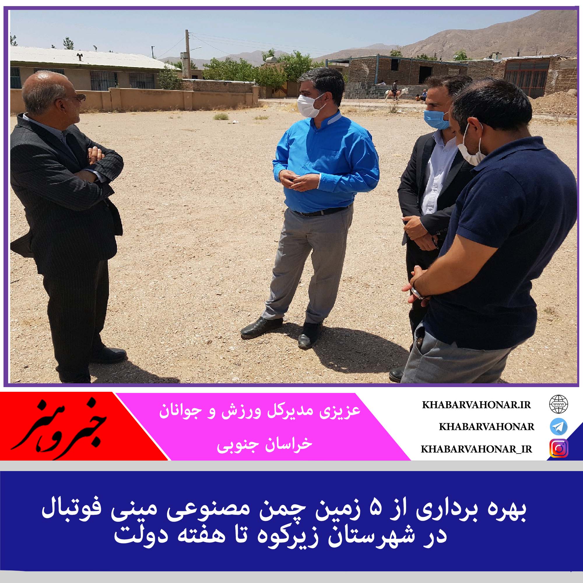 ?عزیزی مدیرکل ورزش و جوانان که برای پیگیری مصوبه های سفر استاندار، امروز جمعه به شهرستان زیرکوه سفر کرده بود از افتتاح پنج زمین چمن مصنوعی مینی فوتبال در شهر آبیز و روستاهای فندخت، گزخت، پیشبر و بقرایی خبر داد و گفت: با بهره برداری از این پنج زمین چمن مصنوعی به سرانه ورزشی زیرکوه که کمترین سرانه فضای ورزشی را در استان دارد هفت هزار و ۵۰۰ متر مربع افزوده می شود.