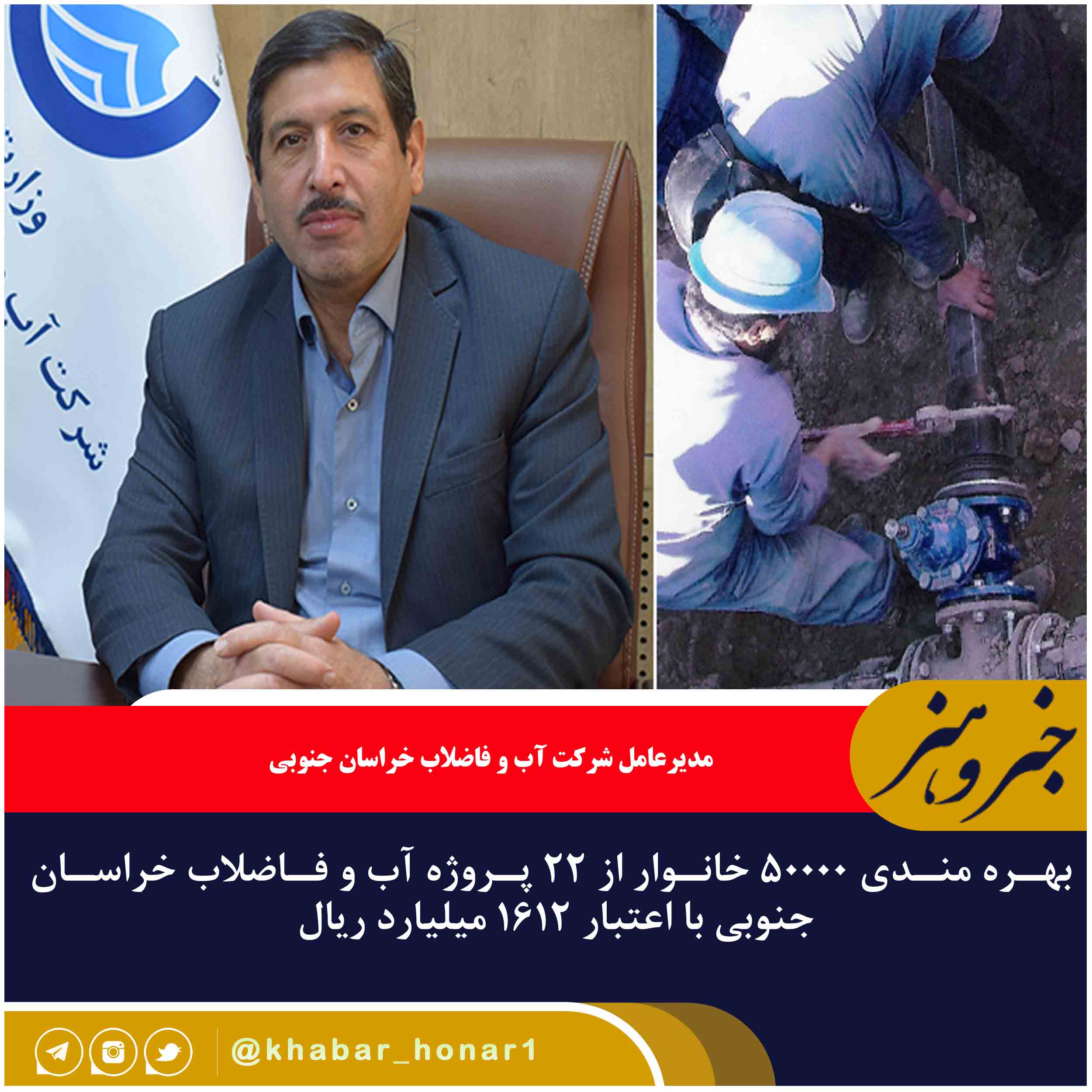 ?مدیرعامل شرکت آب و فاضلاب خراسان جنوبی از بهره برداری از ۲۲ پروژه شرکت آب و فاضلاب استان همزمان با هفته دولت خبر داد و گفت: با افتتاح این پروژه ها ۱۶۰ هزار نفر از مزایای آن بهره مند می شوند که در مناطق روستایی شامل ۱۱۲روستا می شود.