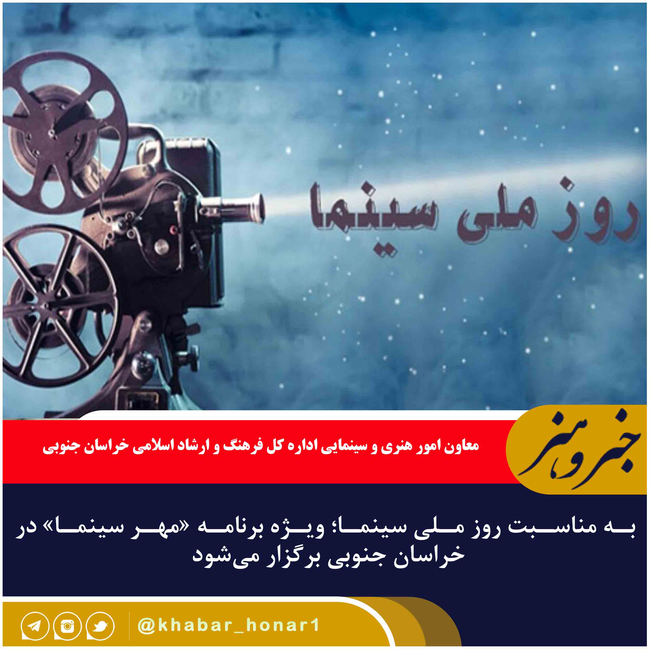 معاون امور هنری و سینمایی اداره کل فرهنگ و ارشاد اسلامی خراسان جنوبی از برگزاری ویژه برنامه مهر سینما به مناسبت روز ملی سینما در استان خبر داد. سید علی زمزم با اشاره به ۲۱ شهریور، روز ملی سینما بیان کرد: ویژه برنامه «مهر سینما» به مناسبت روز ملی سینمای ایران و با هدف تحقق استمرار شادابی و پویایی در سینماها، در خراسان جنوبی برگزار می شود.