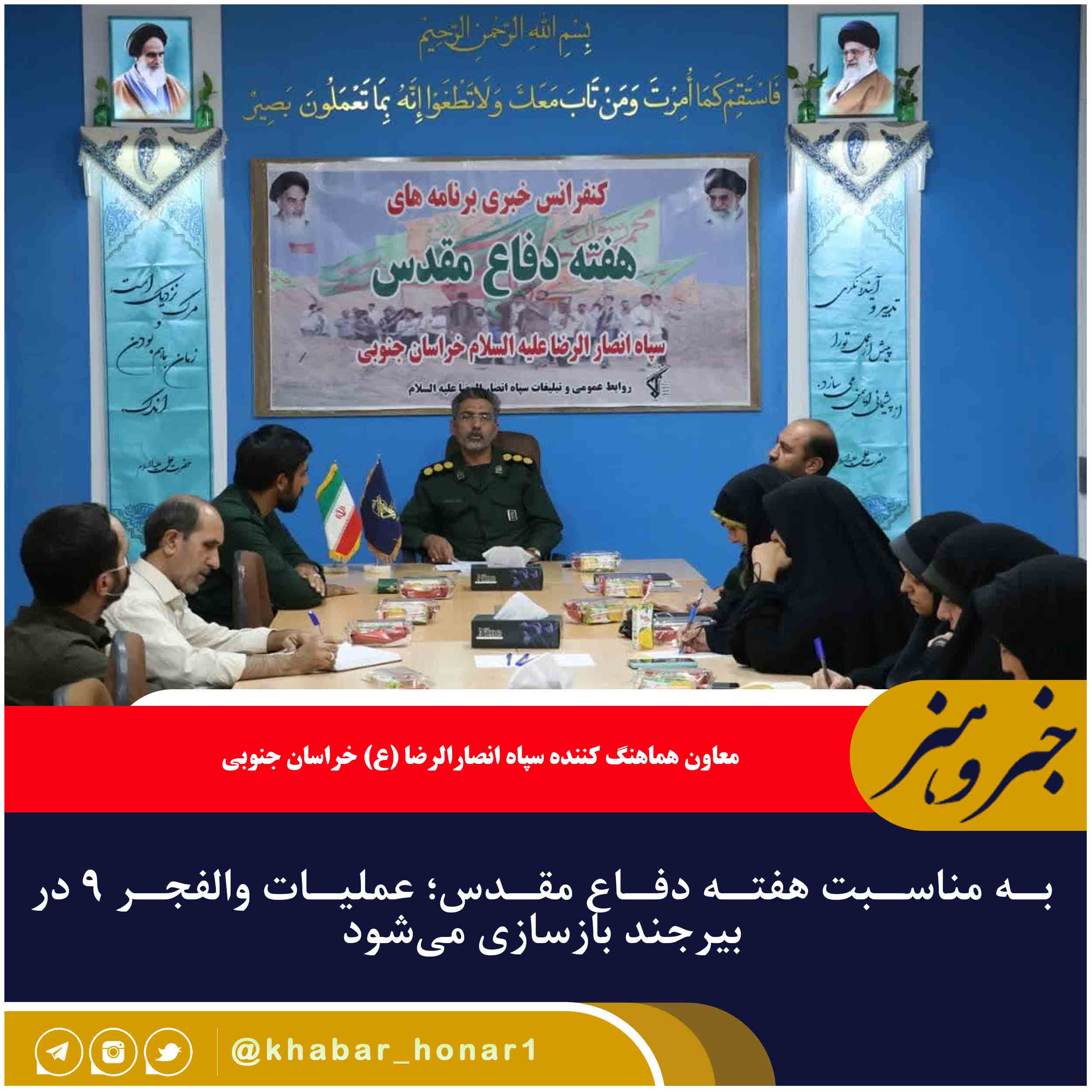معاون هماهنگ کننده سپاه انصارالرضا (ع) خراسان جنوبی گفت: به مناسبت هفته دفاع مقدس بازسازی عملیات والفجر ۹ و نمایش رزمی در منطقه عمومی بیدخت بیرجند به همت تیپ مردمپایه سپاه استان برنامهریزی شده که تلفیقی از برنامههای عملیاتی، رزمی و فرهنگی است.