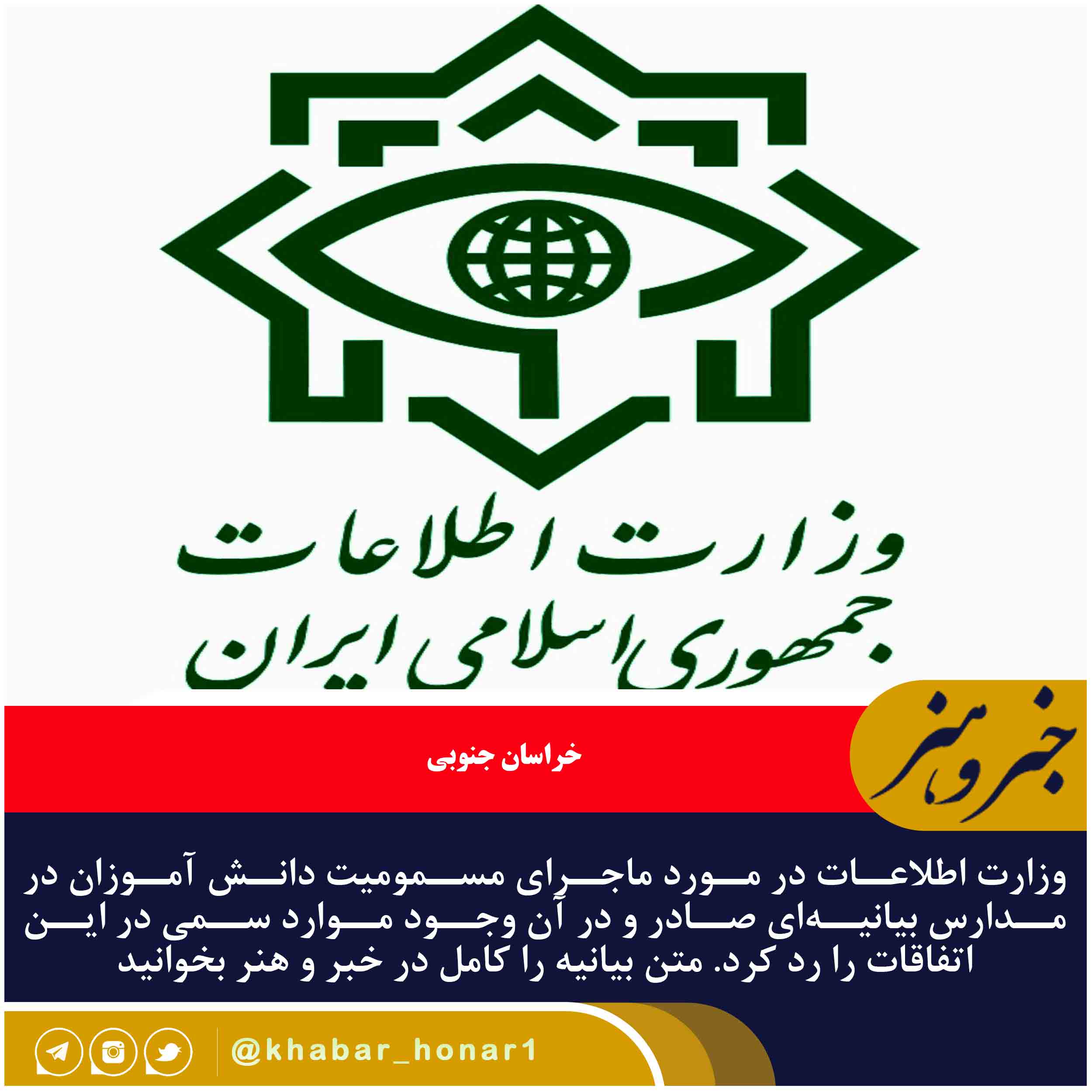 وزارت اطلاعات در مورد ماجرای مسمومیت دانش آموزان در مدارس بیانیهای صادر و در آن وجود موارد سمی در این اتفاقات را رد کرد. همچنین این وزارتخانه وجود هرگونه شبکه در این مورد را نیز غیرواقعی دانست. متن بیانیه تبیینی وزارت اطلاعات به شرح زیر است: