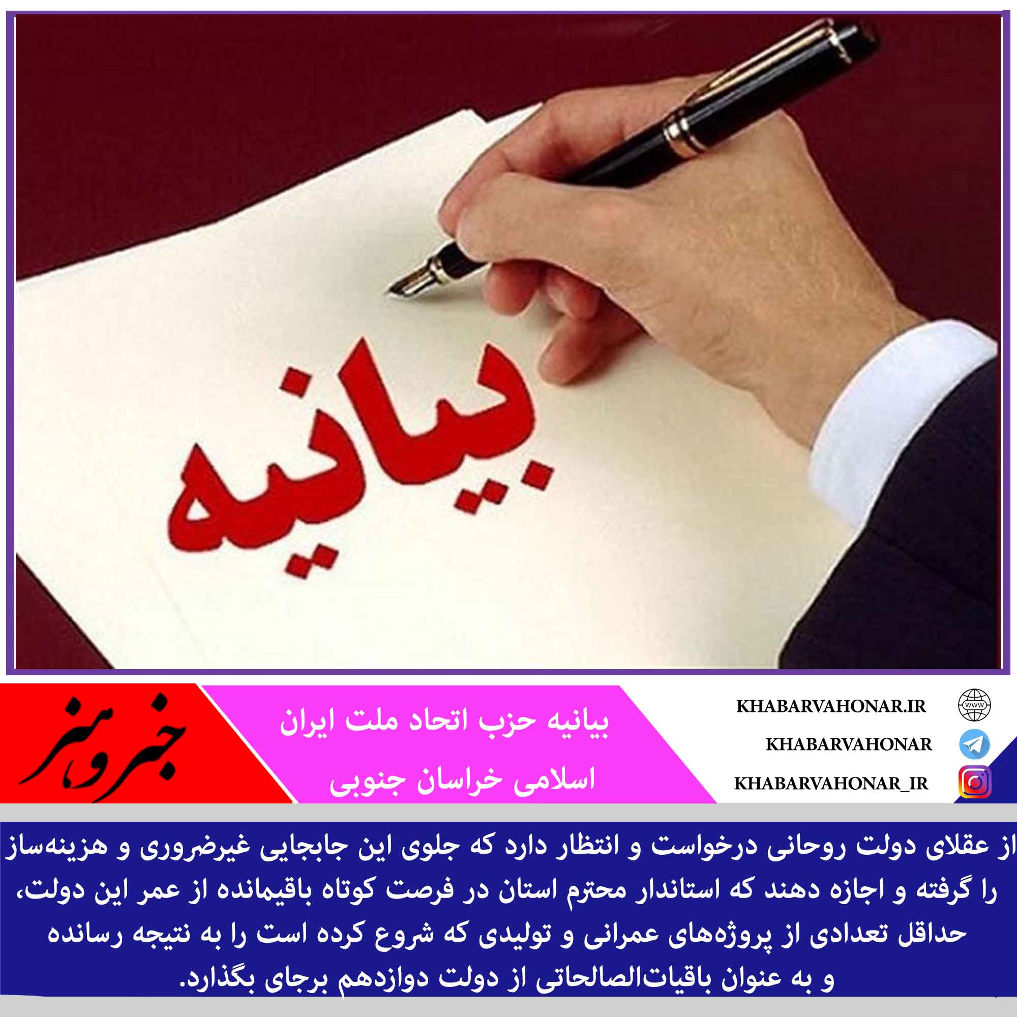 حزب اتحاد ملت ایران اسلامی، منطقه خراسان جنوبی، ضمن ابراز تاسف چندباره از رفتار غیرمسئولانه وزیر کشور در ارتباط با مدیریت این استان محروم، از عقلای دولت روحانی درخواست و انتظار دارد که جلوی این جابجایی غیرضروری و هزینهساز را گرفته و اجازه دهند که استاندار محترم استان در فرصت کوتاه باقیمانده از عمر این دولت، حداقل تعدادی از پروژههای عمرانی و تولیدی که شروع کرده است را به نتیجه رسانده و به عنوان باقیاتالصالحاتی از دولت دوازدهم برجای بگذارد.