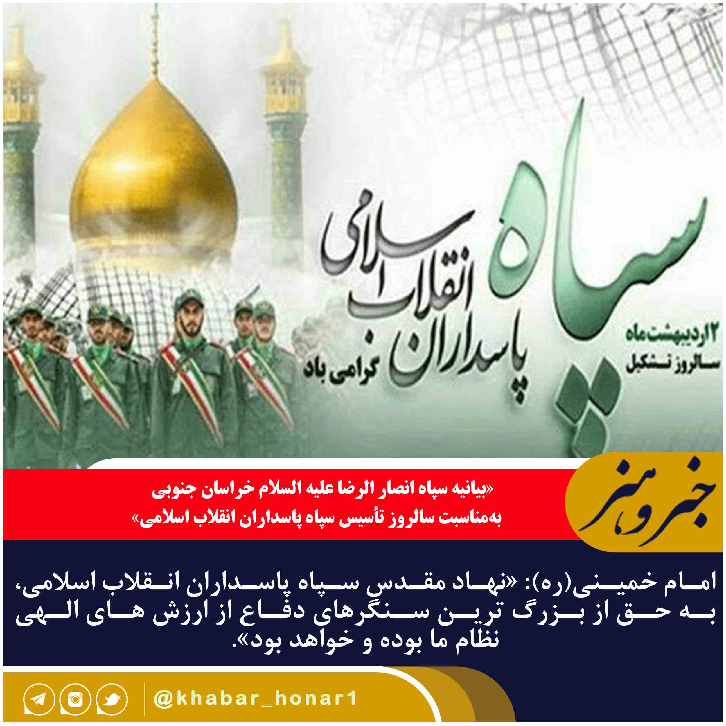 سپاه انصار الرضا علیه السلام استان خراسان جنوبی ضمن گرامی داشت یاد و خاطره شهدای انقلاب اسلامی، هشت سال دفاع مقدس و امنیت پایدار در منطقه و با آرزوی قبولی طاعات و عبادات مردم غیور و شهیدپرور استان در ماه مبارک رمضان و تبریک عید سعید فطر، و تشکر از ابراز محبت و احساسات آحاد مردم نسبت به سپاه ، آمادگی کامل خود را در ادامه خدمترسانی به آحاد جامعه و دفاع و حراست از نظام مقدس جمهوری اسلامی تحت زعامت ولی امر مسلمین جهان حضرت امام خامنهای (مدظلهالعالی) اعلام مینماید.»
