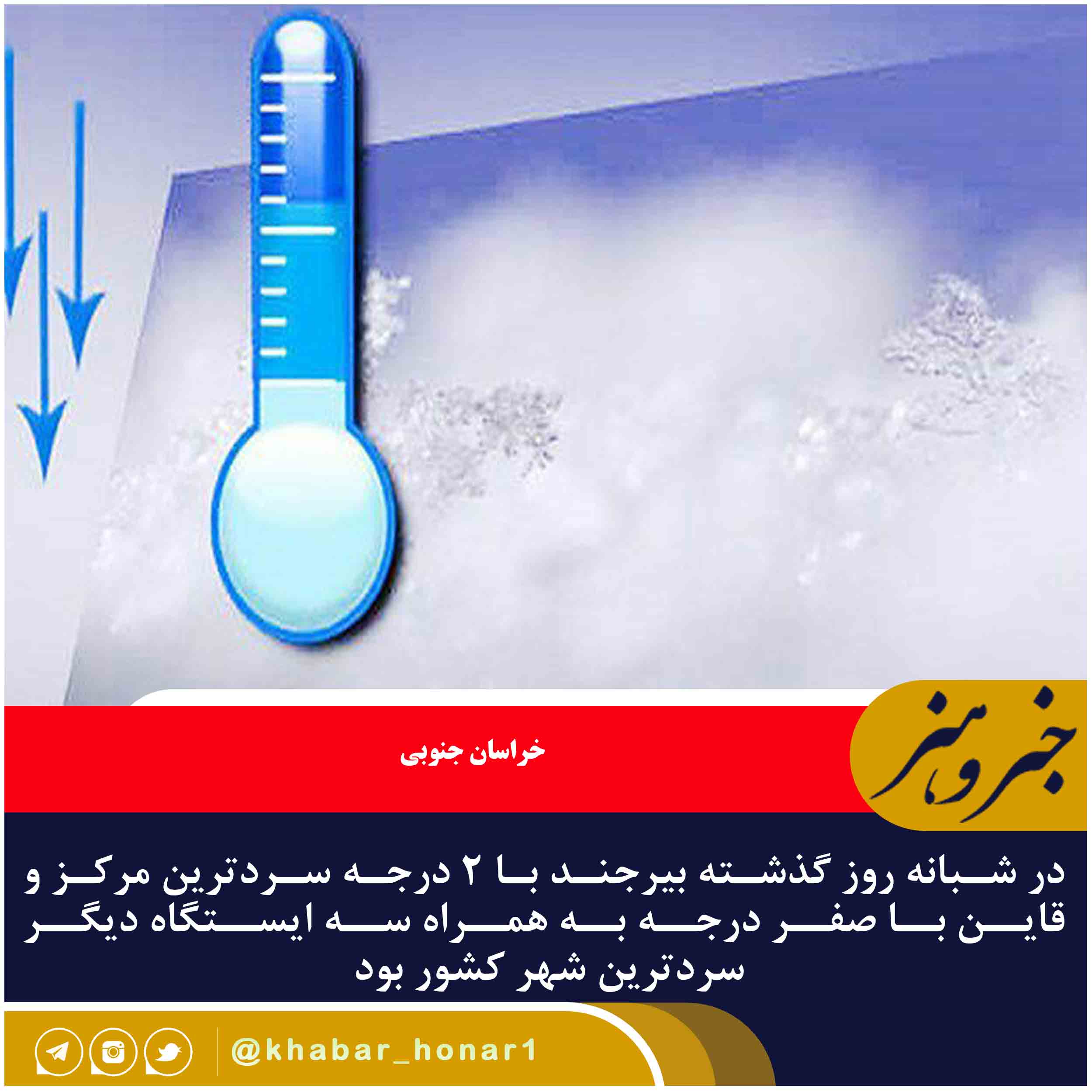 ?در شبانه روز گذشته بیرجند با ۲ درجه سردترین مرکز و قاین با صفر درجه به همراه سه ایستگاه دیگر سردترین شهر کشور بود.