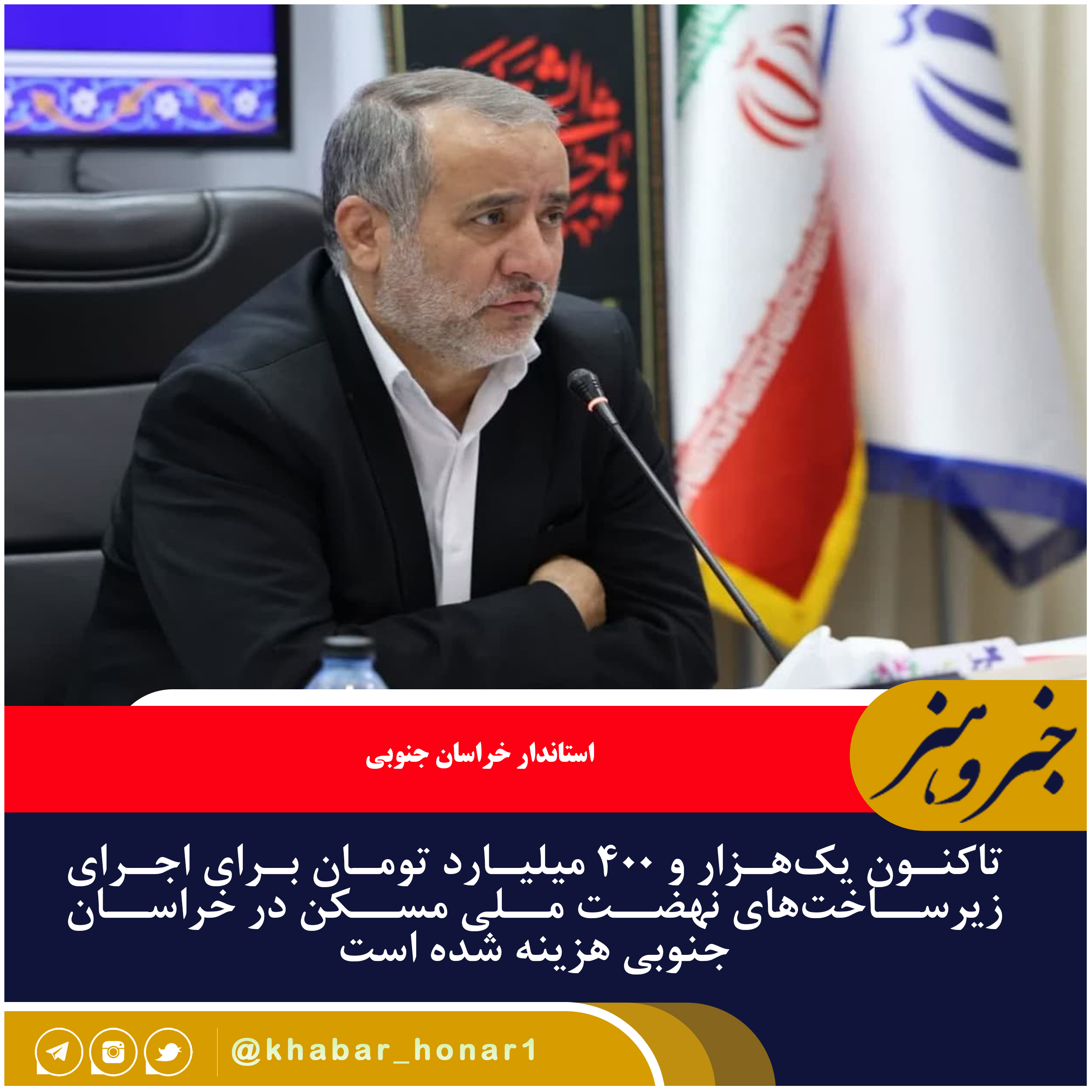 🔹استاندار خراسان جنوبی گفت: تاکنون یکهزار و ۴۰۰ میلیارد تومان برای اجرای زیرساختهای نهضت ملی مسکن در خراسان جنوبی هزینه شده است.