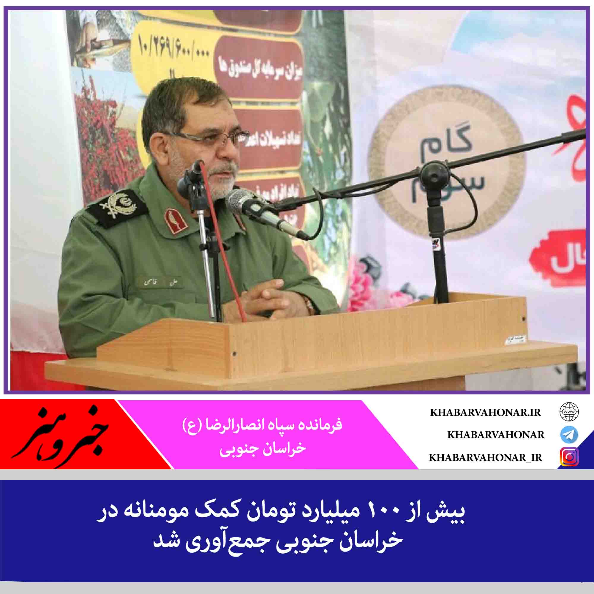 فرمانده سپاه انصارالرضا (ع) خراسان جنوبی گفت: در مرحله سوم از گام سوم رزمایش کمک مومنانه در استان، ۱۰۰ میلیارد و ۸۰۰ میلیون تومان کمک جمعآوری و به جامعه هدف ارائه شد.