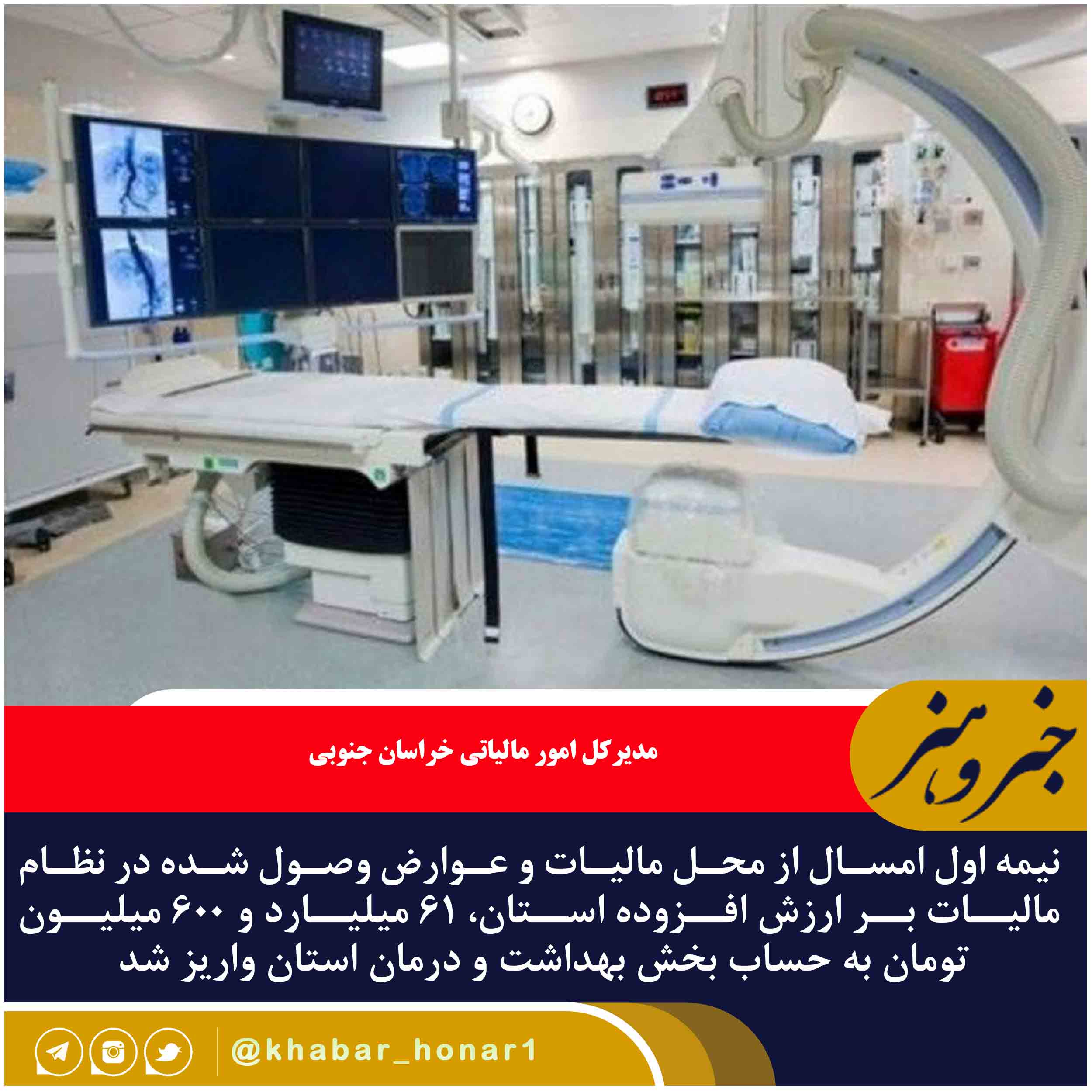 مدیرکل امور مالیاتی خراسان جنوبی گفت: نیمه اول امسال از محل مالیات و عوارض وصول شده در نظام مالیات بر ارزش افزوده استان، ۶۱ میلیارد و ۶۰۰ میلیون تومان به حساب بخش بهداشت و درمان استان واریز شد.