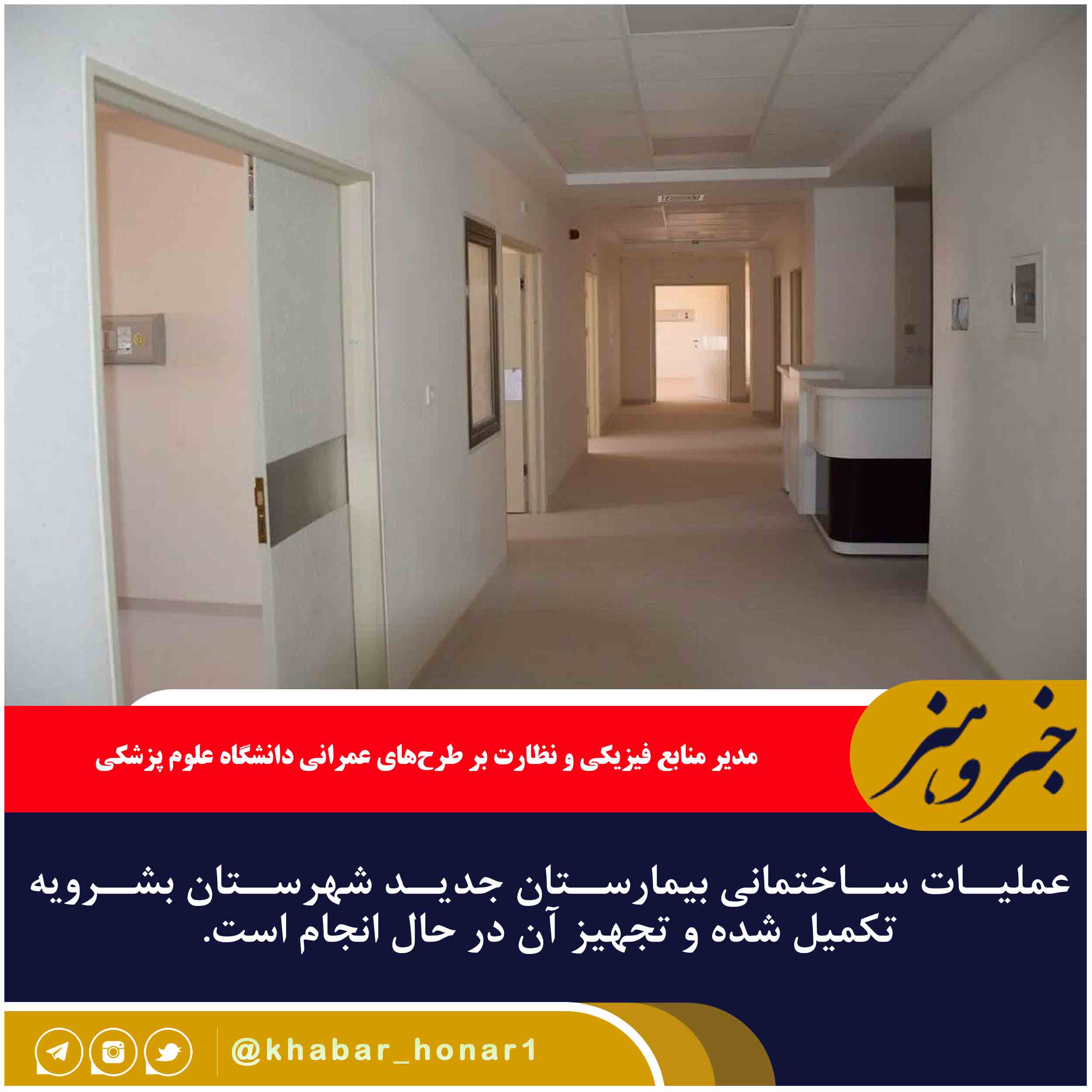 بیمارستان ۳۲ تختخوابی جدید شهرستان بشرویه از پروژههای نیمهتمام و اولویتدار حوزه بهداشت و درمان در خراسان جنوبی است که با گذشت حدود ۱۲ سال از کلنگزنی آن، با اهتمام دولت سیزدهم در مراحل نهایی تکمیل و بهرهبرداری قرار دارد.